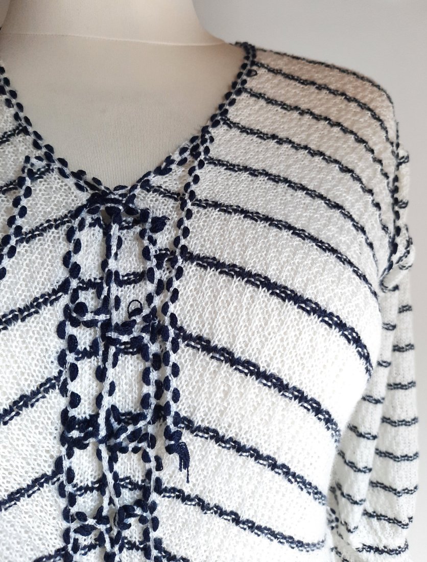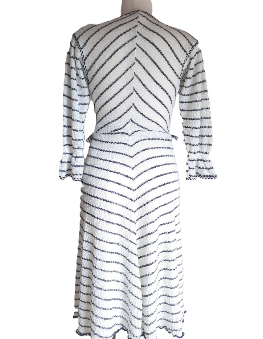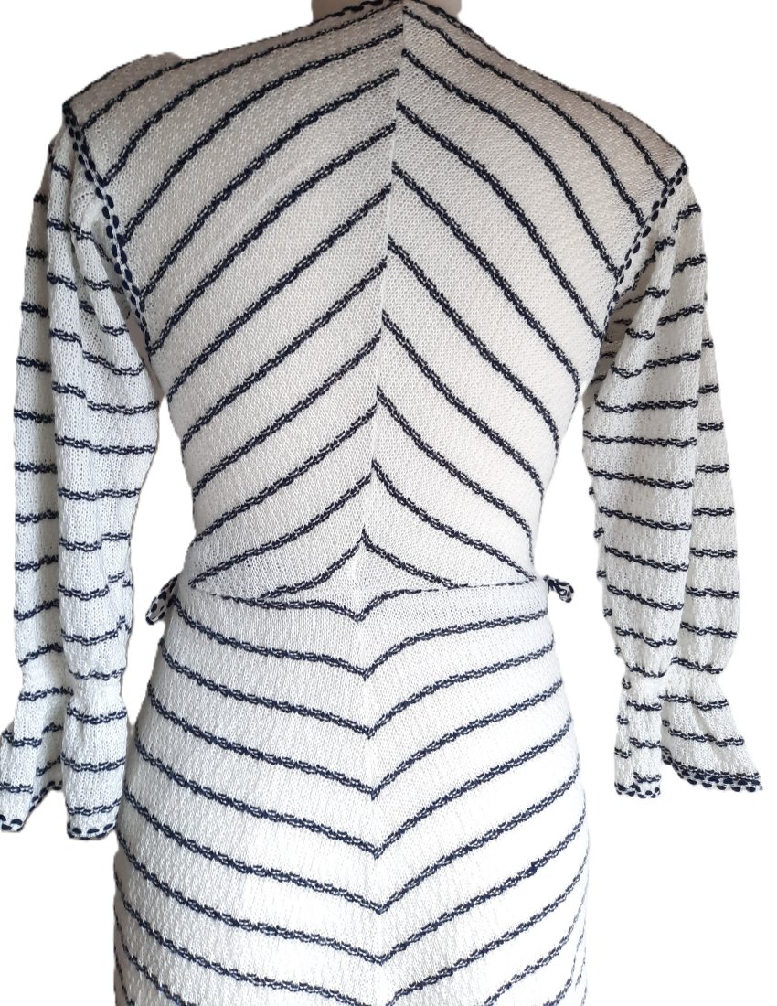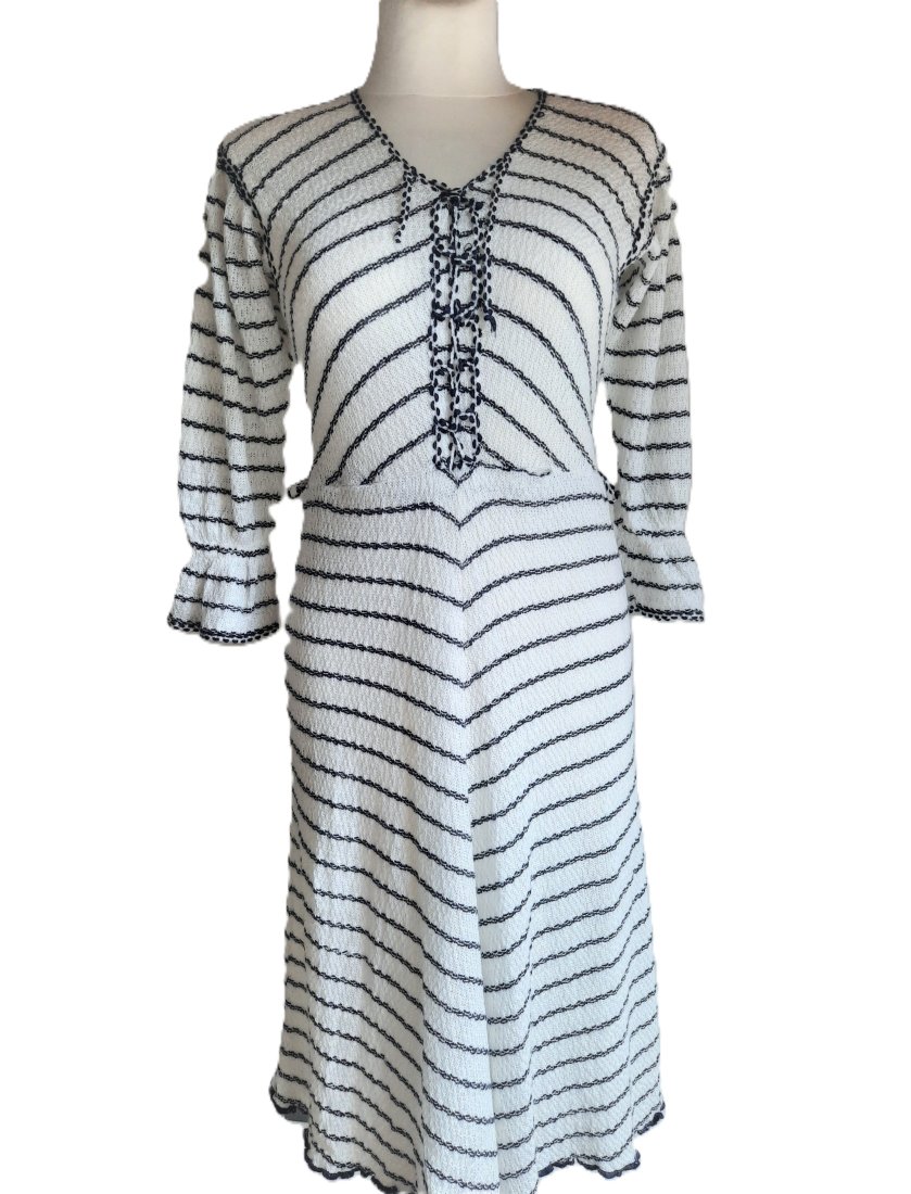 piękna dzianinowa sukienka vintage z dawnej kolekcji C&A z lat według mnie 70-tych, w kolorze białym w drobne poziome paski, dekolt z gorsetowym wiązaniem ściągany troczkami, rękaw o długości 3/4 ściągany gumką i zakończony czymś w rodzaju falbanki, w pasie wszyta gumka, dół na podszewce, rozciągliwy materiał, w pasie szlufki (paska brak), długość poniżej kolan