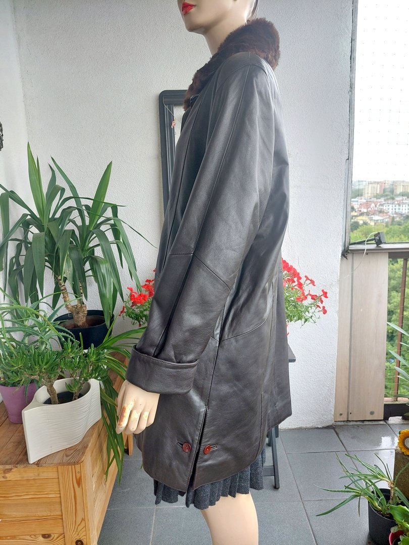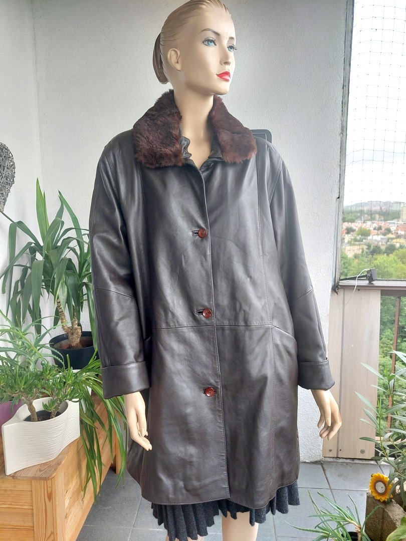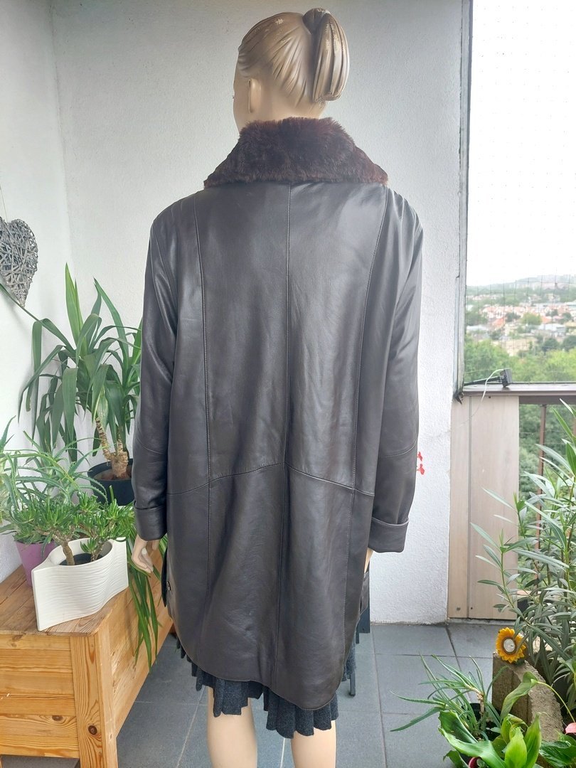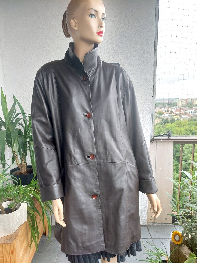 płaszcz vintage marki cabrini ze naturalnej miękkiej skóry naturalnej, lekko ocieplony. skóra bardzo miękka bez przetarć w super stanie, szeroki, lużny, prosty fason, w ramionach małe poduszki, zapięcie na guziki. kolor ciemny brąz. dodatkowo odpinany kołnierz z futerka. Rozmiar z metki 42, proszę sugerować się wymiarami, Na manekinie o rozmiarze 38.