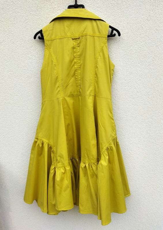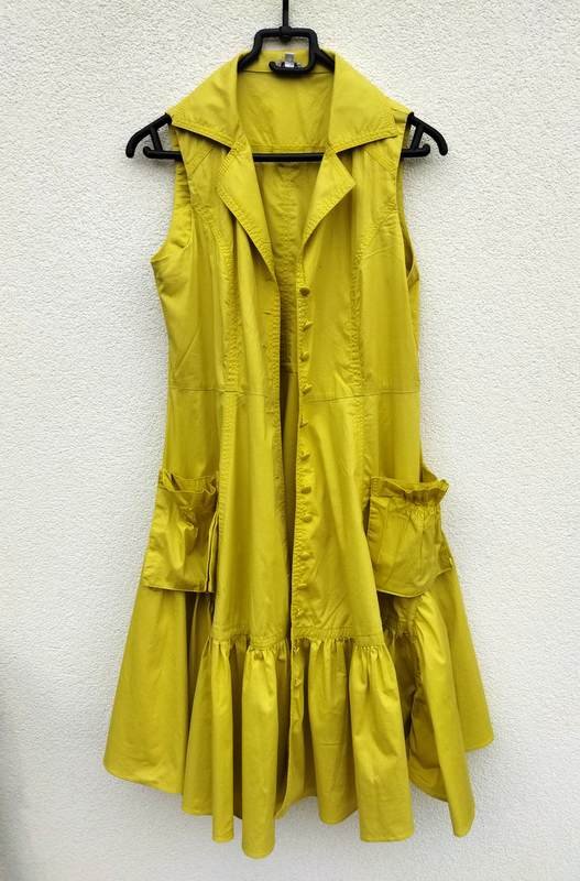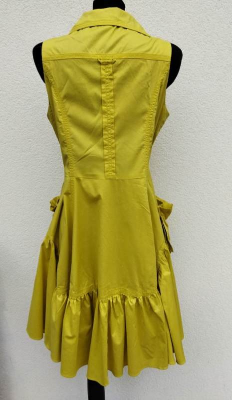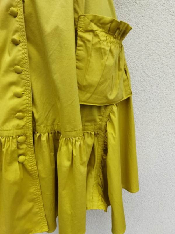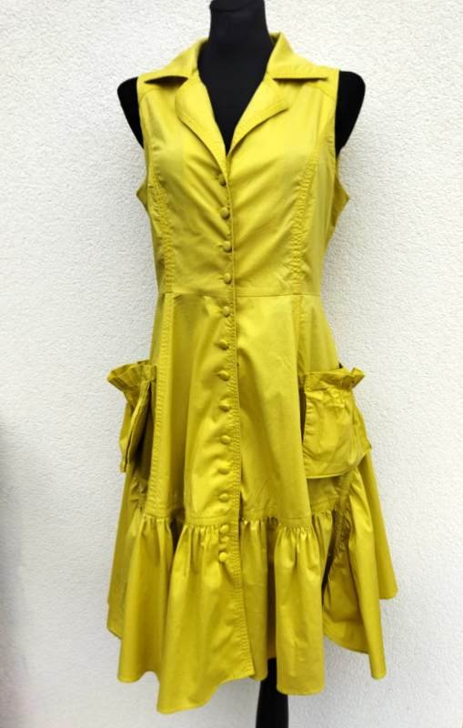 Świetna sukienka z bawełnianej tkaniny w limonkowym kolorze. Odcinana w pasie , z kołnierzem z rewersami , z karczkiem z przodu i z tyłu z kontrafałdką , dół mocno rozkloszowany klinami i półkolistymi godetami z obficie marszczoną doszywaną falbaną, uroki dodają jej wiszące przestrzenne kieszenie. Zapinana na całej długości na obciągane tkaniną guziki.