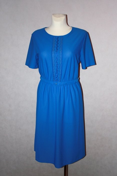 błękitna letnia sukienka vintage z krótkim rękawkiem (kolor bardziej stonowany niż na zdjęciach), z przodu ozdobny haft i drobna prześwitująca siateczka, w pasie gumka, do kompletu błękitny paseczek, wycięta metka ze składem i rozmiarem