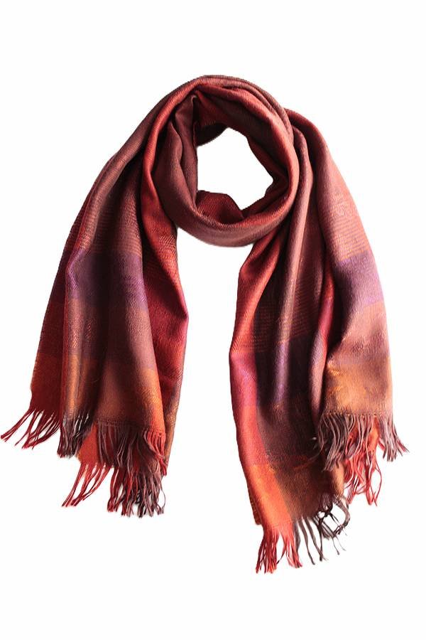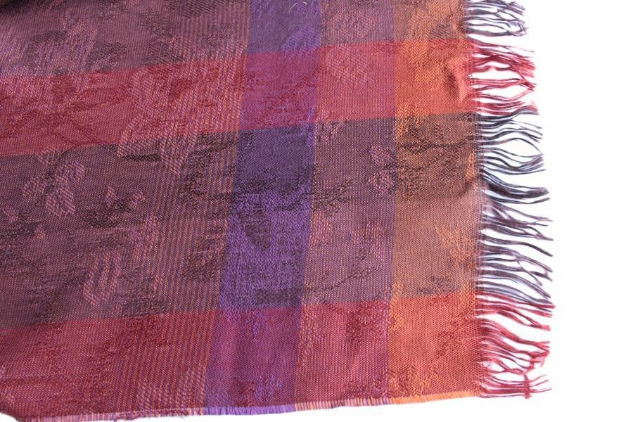 Szal vintage z materiału o średniej grubości w wytłaczaną kratę i subtelne wzory. Tkanina typu wiskoza (brak metki). Szal można nosić cały rok.