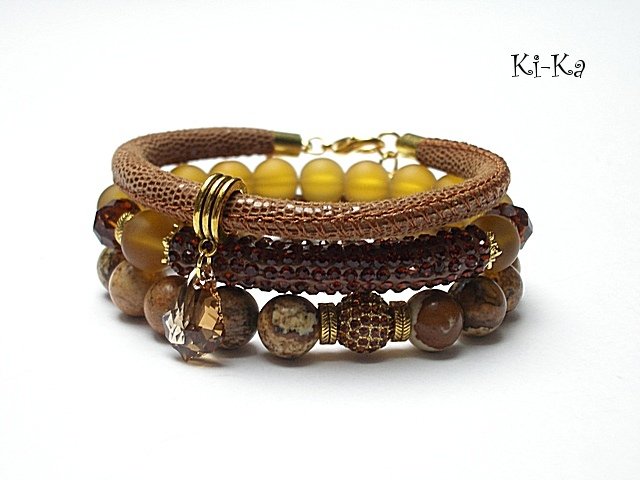 PROJEKT AUTORSKI. WŁASNOŚĆ KI-KA. KOPIOWANIE ZABRONIONE. Komplet trzech bransoletek wykonanych z naturalnych kamieni - jaspis krajobrazowy [10mm] , matowe szkło [10mm], rzemienia z naturalnej, miękkiej skóry cielęcej, ekskluzywnej przekładki wysadzanej cyrkoniami, tuby wysadzanej kryształkami, przywieszki z kryształkiem Swarovskiego, kryształków fasetowanych [8 x 10mm] oraz elementów metalowych w kolorze złota. Bransoletki pasują na nadgarstek 16-17cm. Biżuteria ozdobnie zapakowana