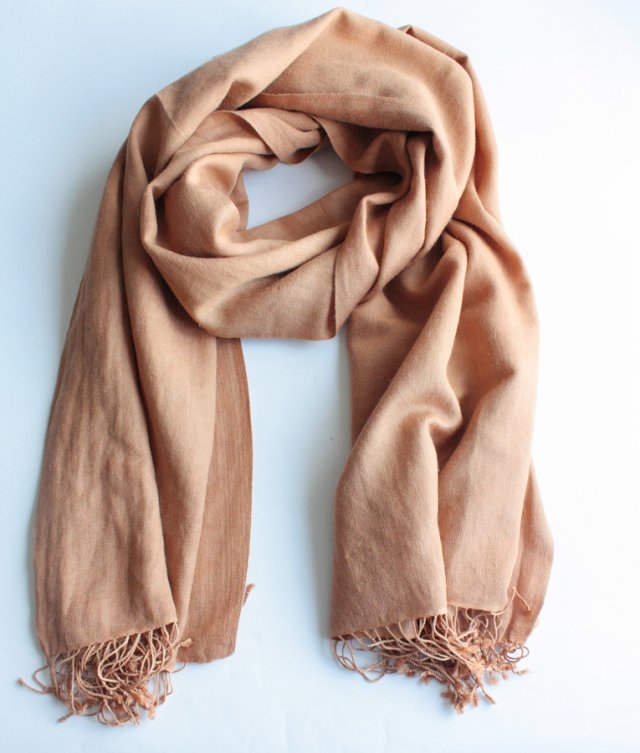 Miękki, wielki szal w pięknym camelowym odcieniu beżu. W mojej ocenie jest to Pashmina (szal z kaszmiru), jednak szal nie ma metki.