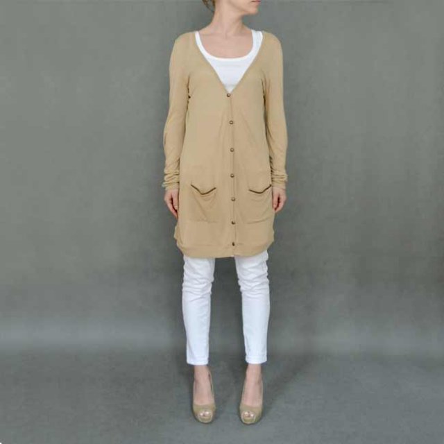 Camelowy kardigan. Bardzo lekki i cieniutki. Zapinany na metalowe guziczki. Na łokciach łaty z imitacji zamszu - podobnie lamówki przy kieszonkach. Polecam bardzo.