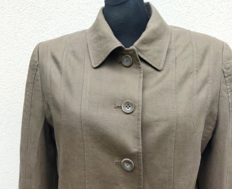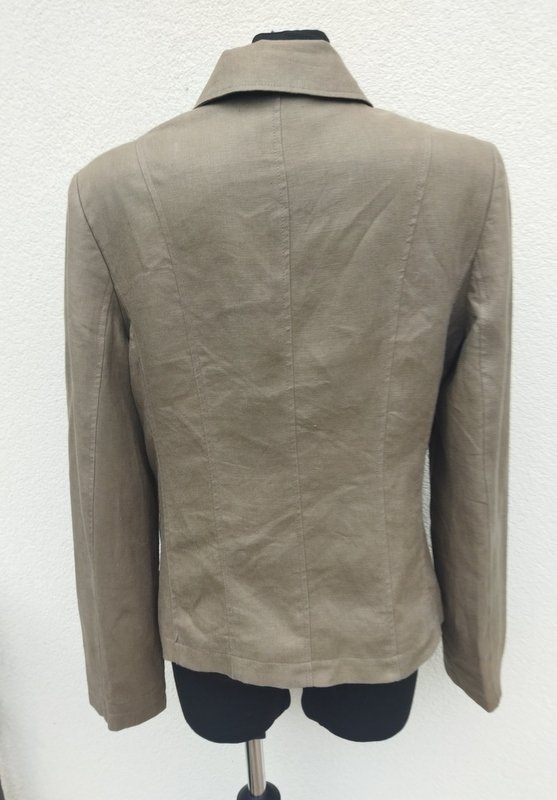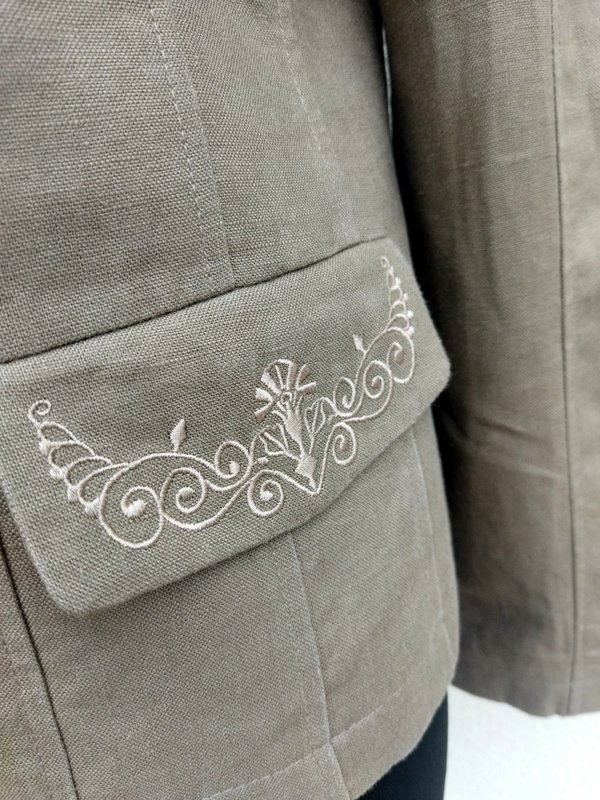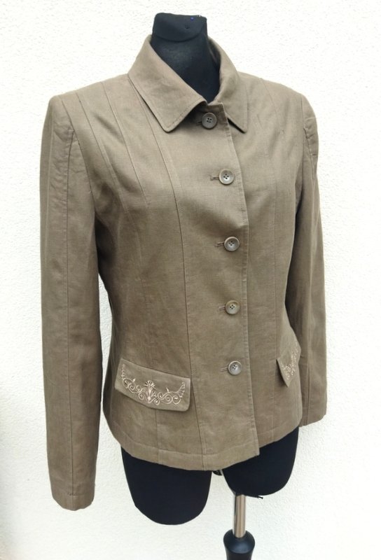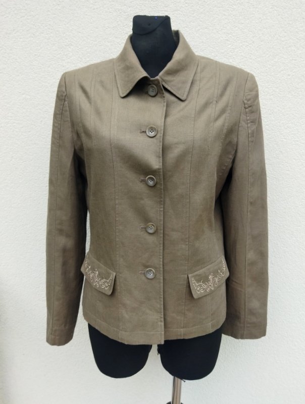 Marynarka z lnianej tkaniny w kolorze przygaszonej zieleni- kolor zbliżony do khaki, starannie uszyta i wykończona. Lekko taliowana , z kołnierzykiem, z dwiema wpuszczanymi kieszeniami z patkami ozdobionymi haftem w nieco jaśniejszym odcieniu. Zapinana na guziki. całość na podszewce