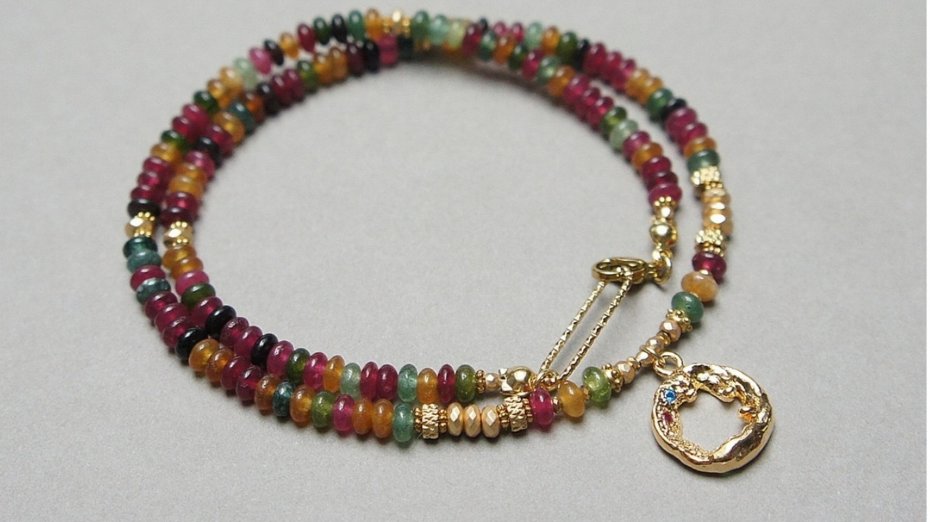 Krótki, delikatny naszyjnik wykonany w całości z pozłacanej stali szlachetnej oraz kamieni - oponek kolorowych jadeitów [4 x 2mm], dysków hematytów fasetowanych, platerowanych [3 x 2mm], przekładek z hematytu [1mm i 2mm] oraz zawieszki wysadzanej cyrkoniami. Naszyjnik o długości ok. 43cm.