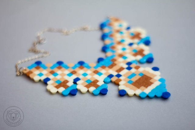 Niezwykła kolia przywodząca na myśl podróże w najdalsze zakątki świata. Wyjątkowe zestawienie błękitów i brązów ubrane w nowoczesną, pikselową formę. Kolia, która sprawi, że poczujesz się tajemniczo i oryginalnie. Długość z łańcuszkiem 27,5 cm. Łańcuszek z zapięciem w kolorze miedzi, materiał: plastikowe koraliki.