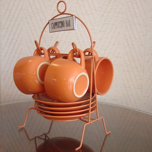 zestaw 4 sporych filiżanek ze spodkami oraz wieszakiem, oryginalnie zapakowane ( super prezent)
