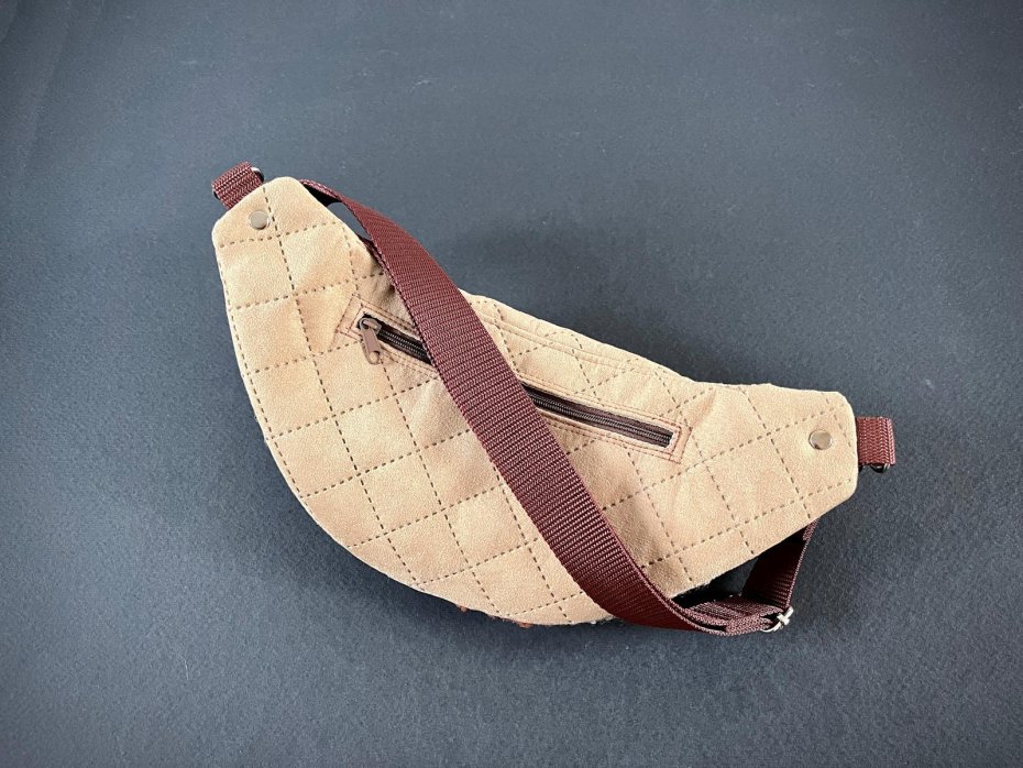 Uszyta ręcznie w Polsce z wysokiej jakości ekozamszu pikowanego, nerka jest trwała, miękka w dotyku i przyjemna w użytkowaniu. Model M łączy pojemność z lekkością – pomieści telefon, portfel, klucze i drobne kosmetyki. Regulowany pasek o szerokości 3 cm zapewnia wygodne noszenie na biodrach lub przez ramię.
