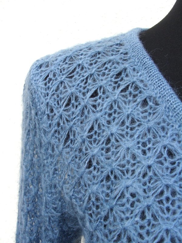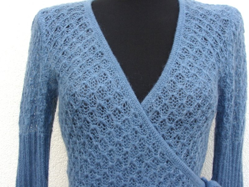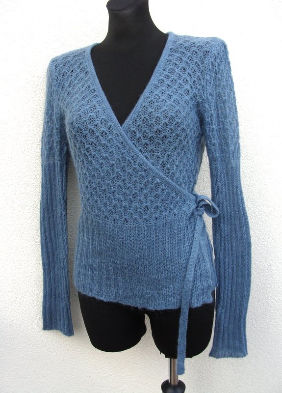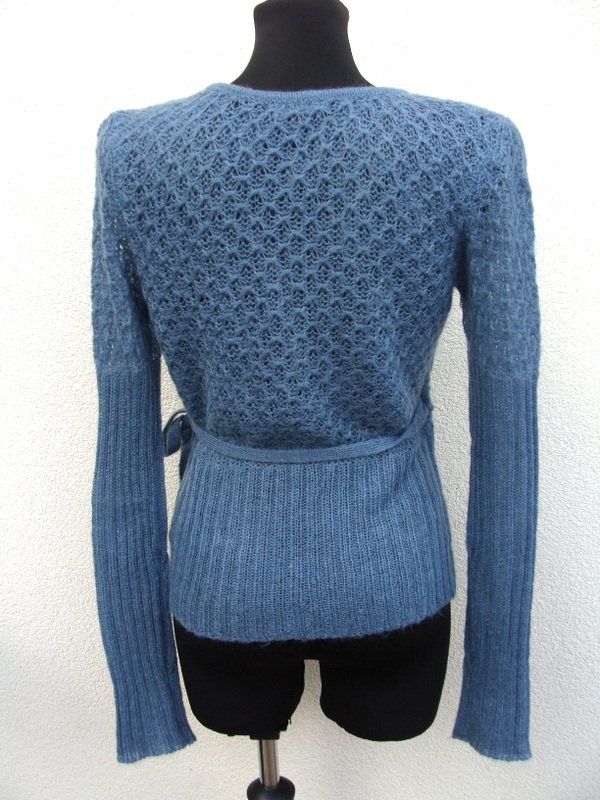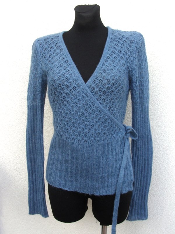 Sweterek z akrylowej włóczki z moherem w zgaszonym niebieskim kolorze. Zakładany kopertowo , wiązany z jednego boku na troczki, z dekoltem w szpic , na wysokim ściągaczu u dołu. Wykonany lekko ażurowym muszelkowym wzorem , rękawy od połowy przedramienia ściegiem ściągaczowym.