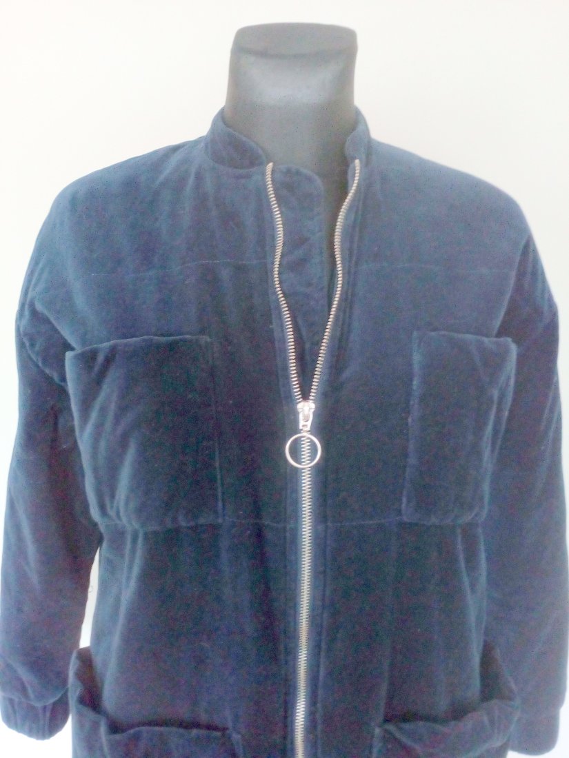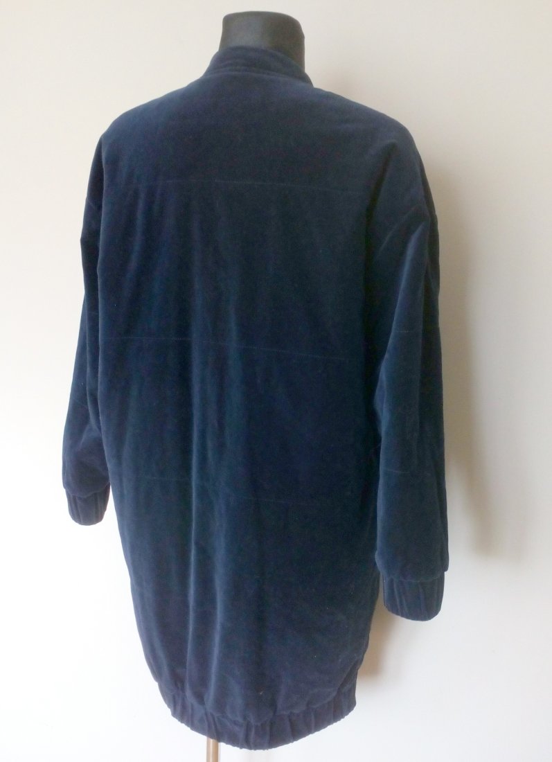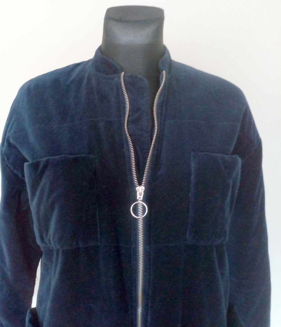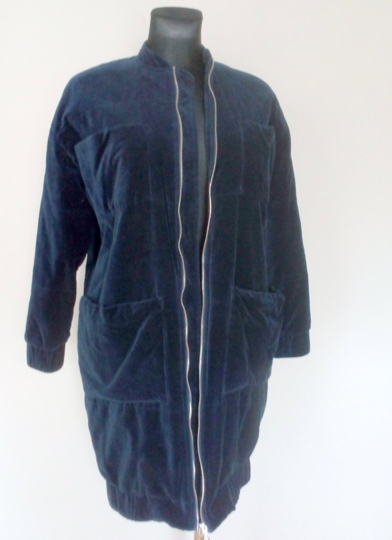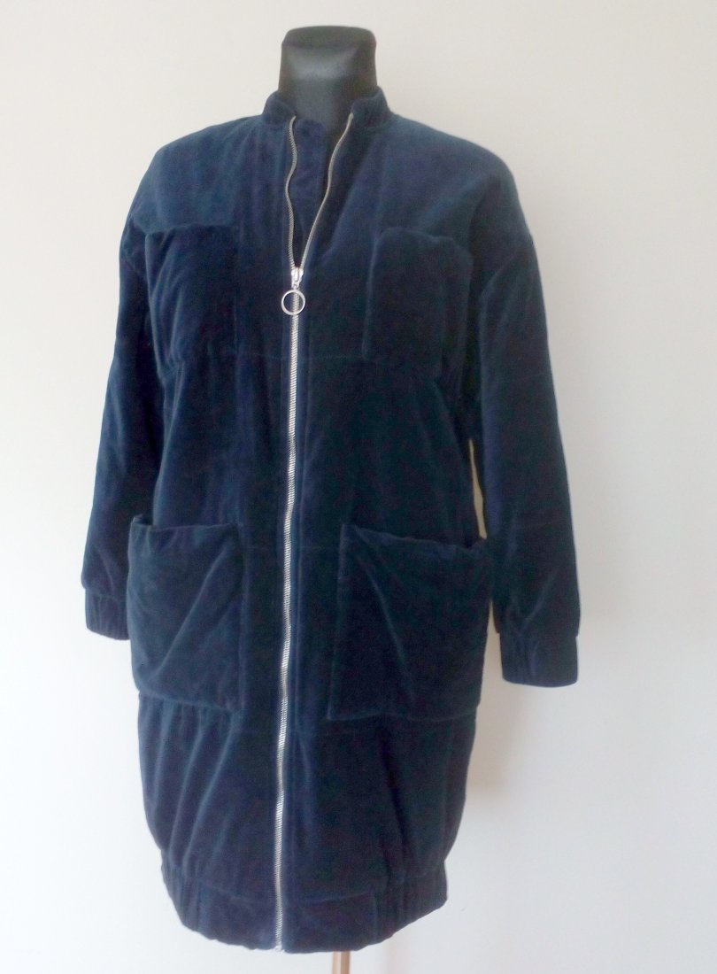 Aksamitny, ocieplany płaszcz w granatowym kolorze, zapinany na zamek, z przodu naszywane kieszenie - dwie na piersiach i dwie u dołu, dól płaszcza i dół rękawów zmarszczone szeroką gumą obszytą tkaniną, wokół szyi stójka, od środka granatowa podszewka