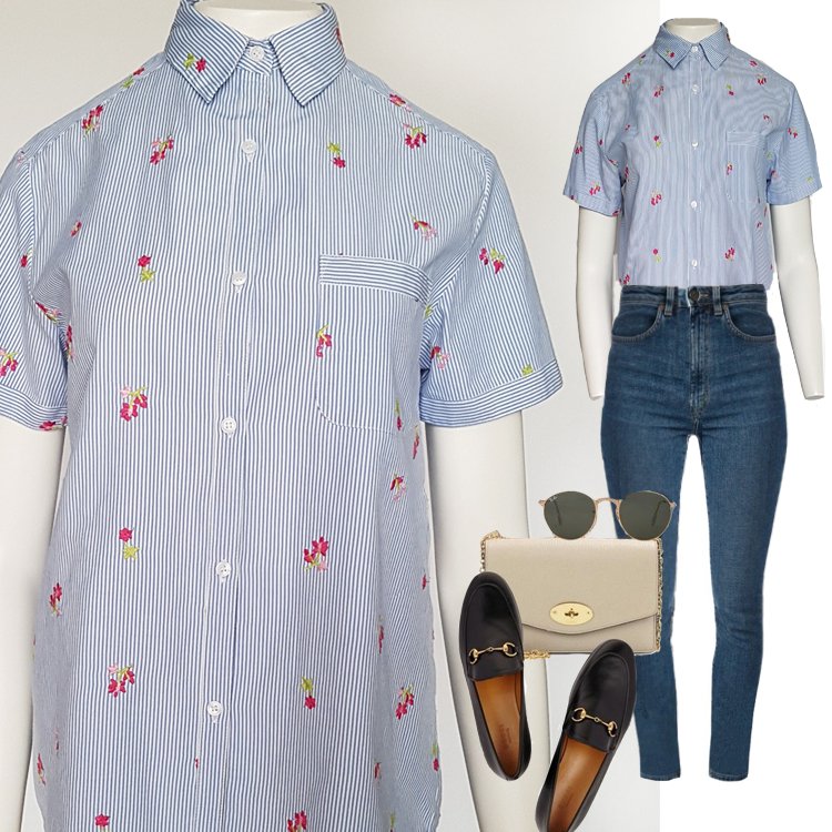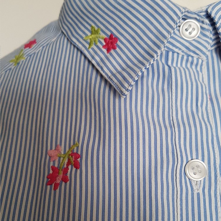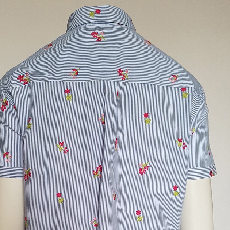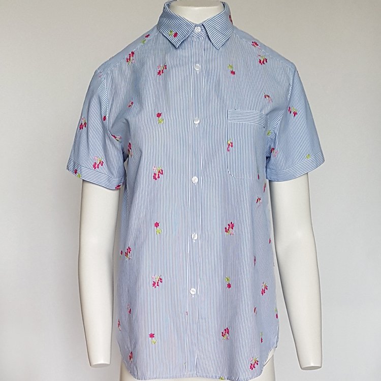 Koszula damska z krótkim rękawem, na piersi kieszonka, zapinana na guziki. Przyjemna tkanina w drobne paseczki haftowana małymi kwiatkami. Będzie pasowała zarówno do letnich, wakacyjnych zestawień z szortami, czy spódnicą, jak i pod marynarkę.