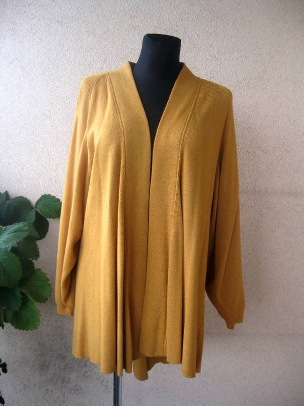 Niezwykle oryginalny sweter/narzutka vintage w miodowym kolorze. Materiał 40% bawełna, 60% wiskoza, dosyć ciężki. Fason raglanowy z niższą pachą, tył dłuższy, fason oversize. Stan bardzo dobry. Rozmiar z metki L. Podaję wymiary mierzone na płasko;