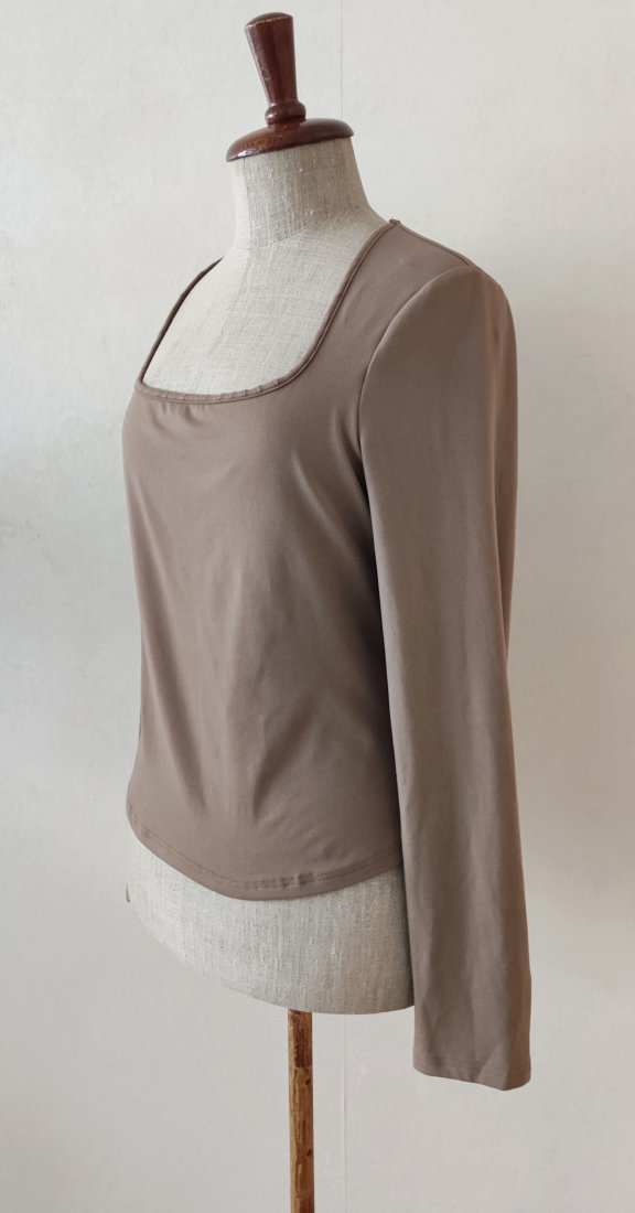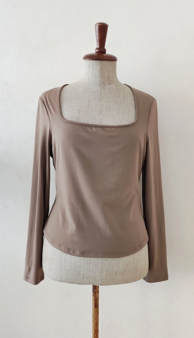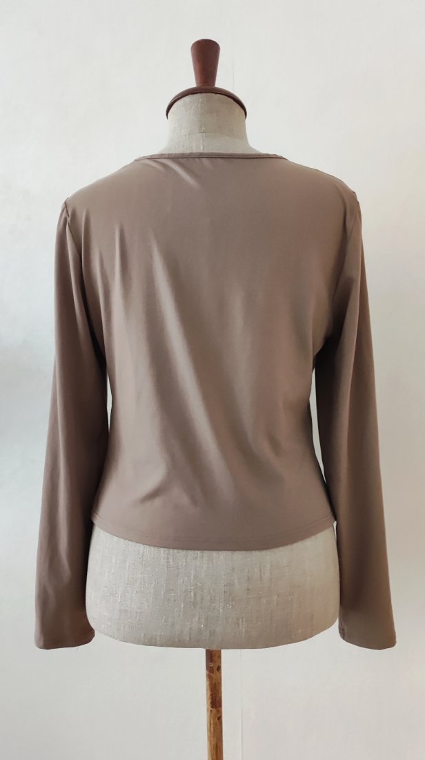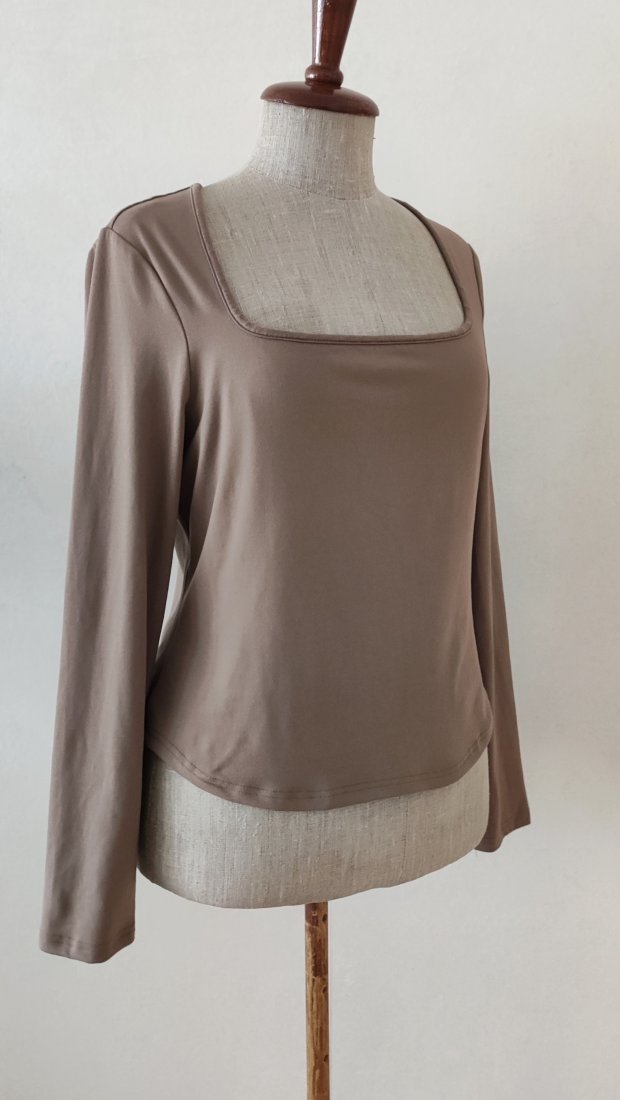 Bluzka z grubszej bawełny z elastanem w kolorze kakaowym, rozciągliwa i ładnie dopasowująca się do sylwetki.