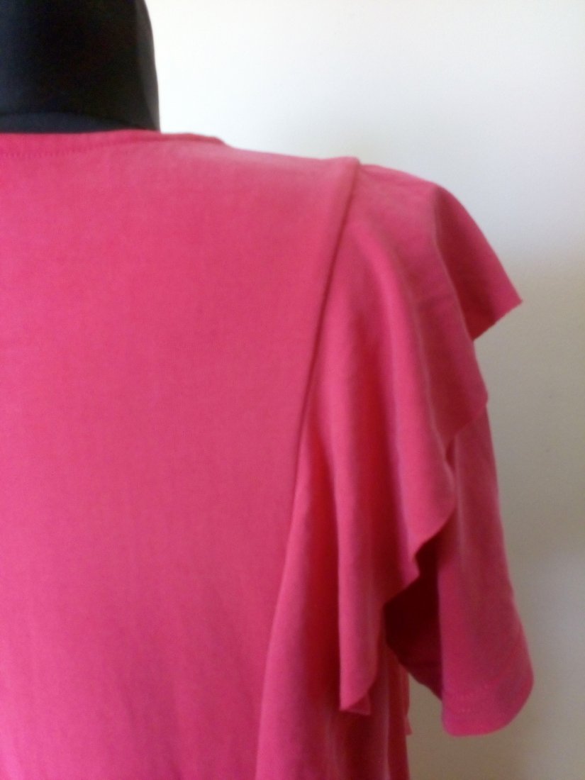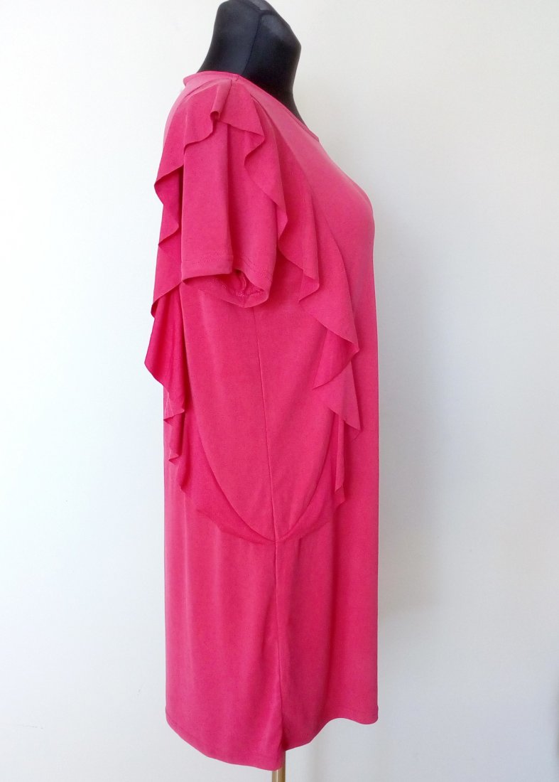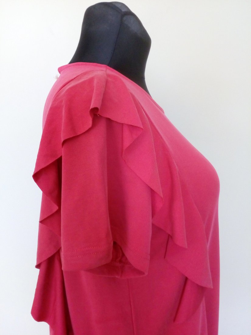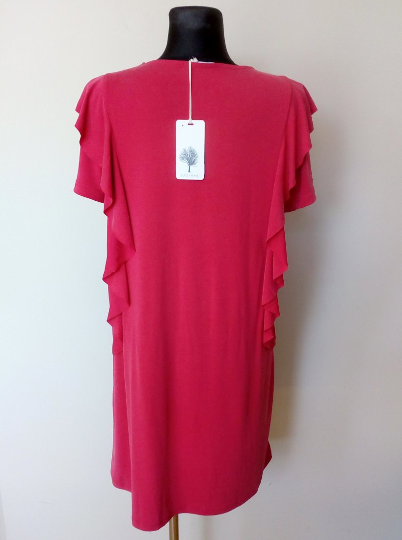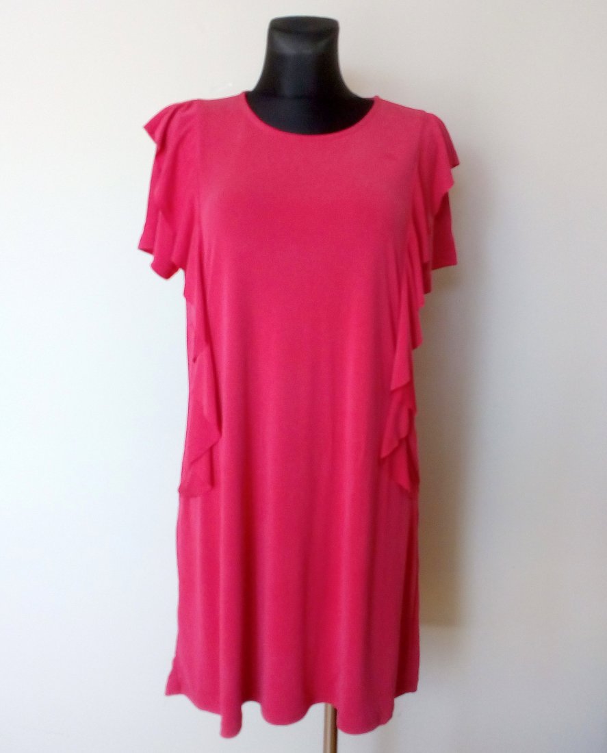 Nowa sukienka z dzianiny w czerwonym, malinowym kolorze, dekolt okrągly, rękaw krótki, z przodu i ztyłu od ramion do górnej części uda luzne falbany, sukienka bez podszewki, nie prześwituje, cena na metce 129,90 zł