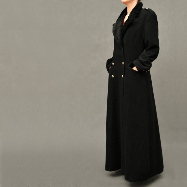 Czarny, długi płaszcz z kaszmirem i wełną. Zapinany na piękne, postarzane guziki, posiada patki na ramionach i guziczki ozdobne na rękawach. Po bokach kieszonki. Ma piękny, miękki kołnierz z fakturą w carskim stylu. Polecam bardzo.