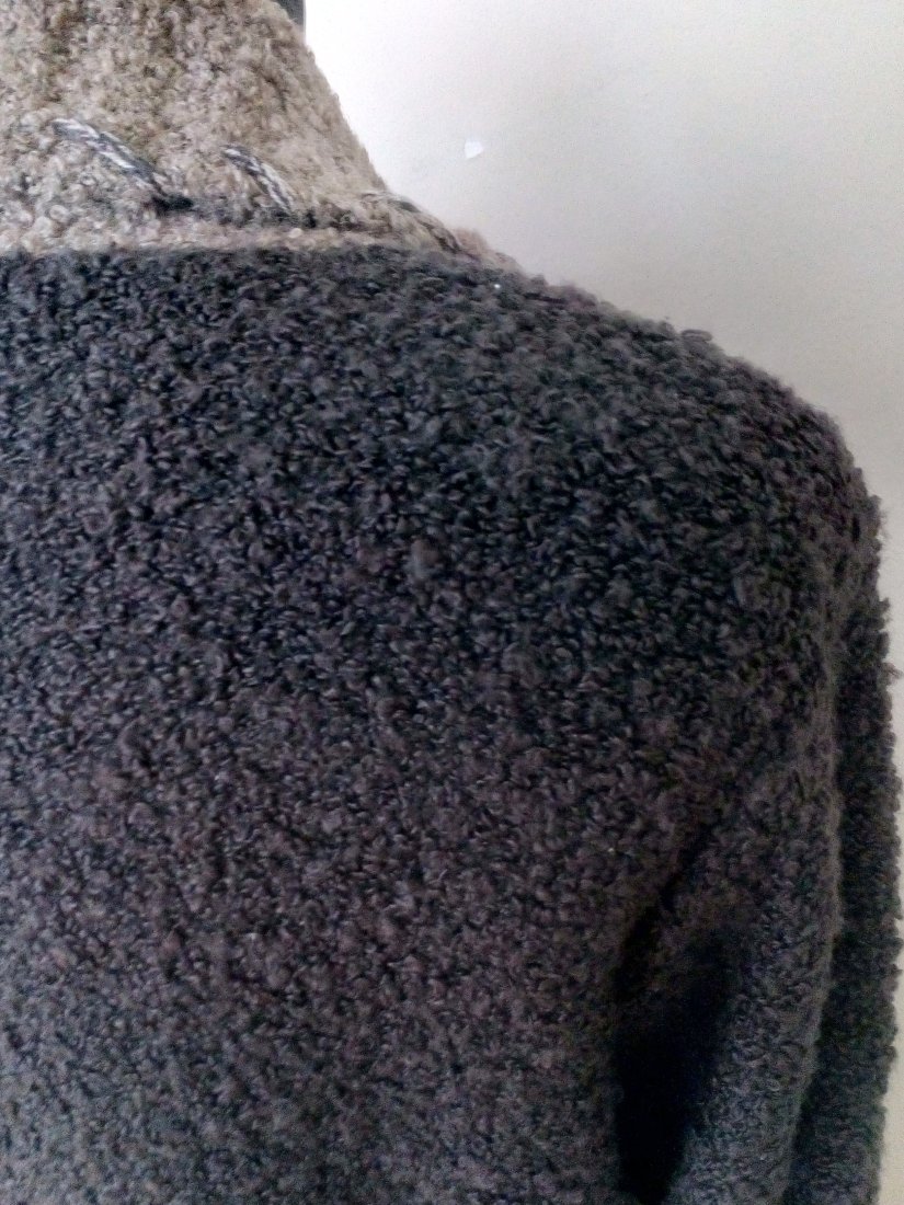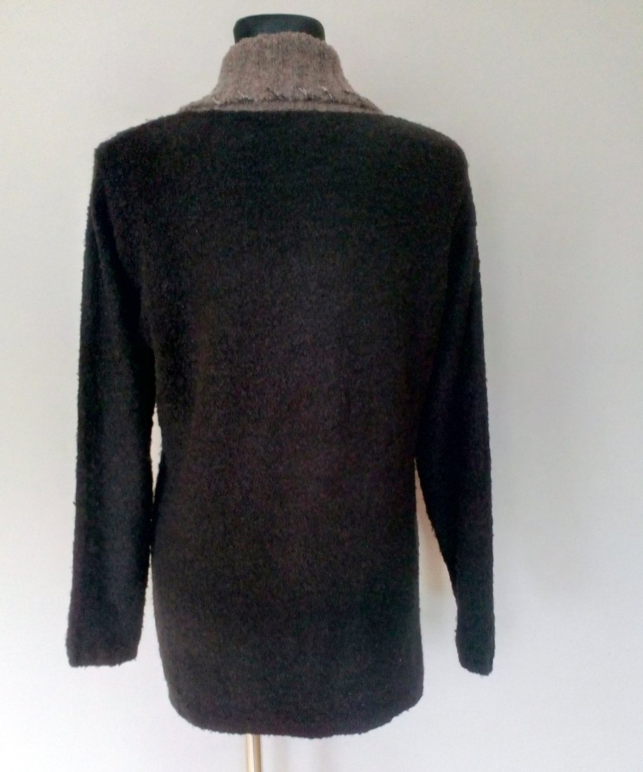 Kardigan z czekoladowej włóczki typu boucle, myślę, że nowy - posiada zawieszkę od metki, zapinany na ładne, brązowe guziki, przód zdobiony aplikacją i haftem