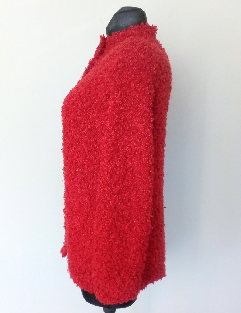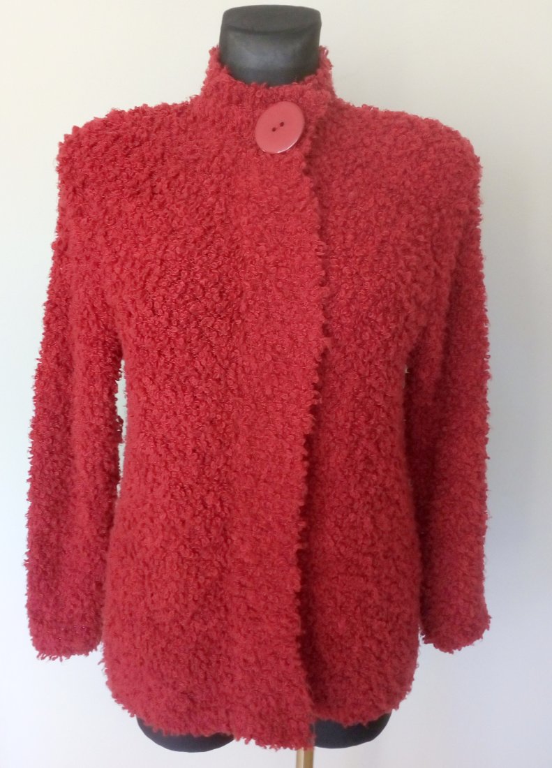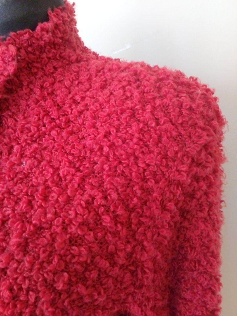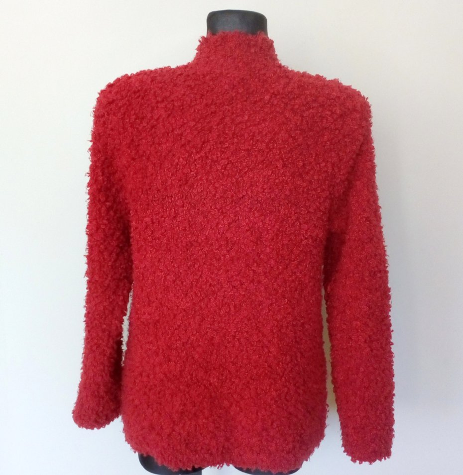 Czerwony sweter z włóczki typu boucle, zapinany pod szyją na jeden zatrzask z dużym guzikiem po górze, na ramionach poduszki