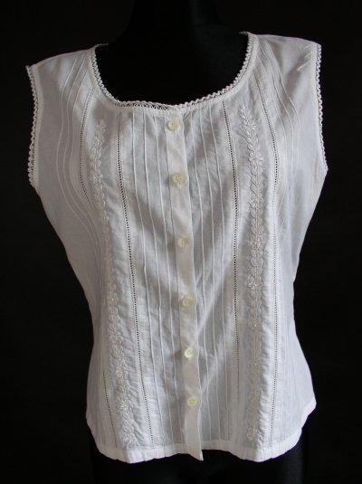Biała bluzka firmy CASUAL WOMAN.Rozmiar 40.Materiał bawełna.Bez rękawów.Dekolt i pachy obszyte ozdobną taśmą.Zapinana z przodu na guziki.Przód ozdobiony szczypankami , haftem i mereżką.Po bokach małe rozporki.Stan bardzo dobry.Długość 51 cm.pod pachami 102 cm.