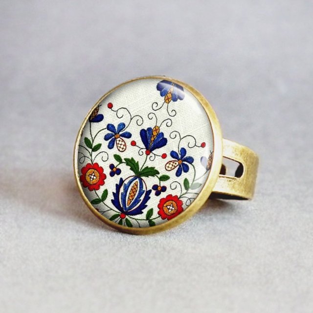 Oryginalny pierścionek z okrągłym oczkiem z unikatową grafiką artystyczną, zatopioną pod szklanym kaboszonem (wypukłym szkiełkiem) i oprawioną w bazę w kolorze antycznego brązu (nie zawiera niklu i ołowiu, hipoalergiczna). Grafika jest najwyższej jakości, wywołana na wysokiej klasy papierze fotograficznym.