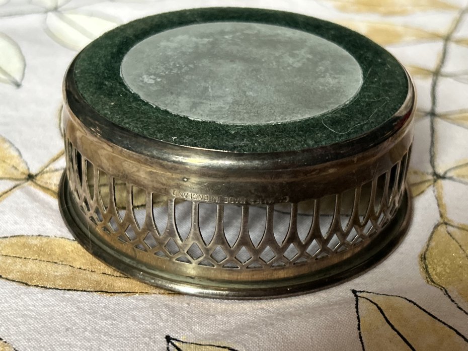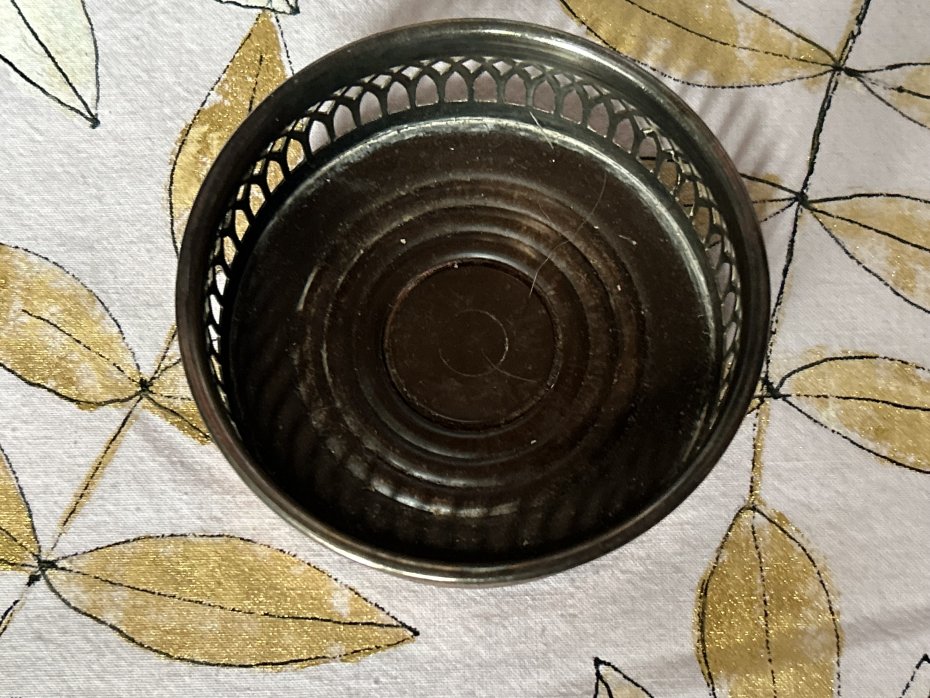 Elegancka podstawka na stół- z założenia pod butelkę. Dobrze wykonana, oryginalna , subtelnie zdobiona. Metal srebrzony . Od spodu filc zapobiegający rysowaniu stołu i metalowy stabilizator . Sygnowana CAVALIER Made in England . Góra 9,5 cm Dół 8,5 wysokość trochę ponad 3,5 cm. Stan zachowania bardzo dobry minus. Drobne ślady użytkowania. UWAGA! PLATERY PRZECHOWUJEMY W SZCZELNYM OPAKOWANIU, PRZED UŻYCIEM TRZEBA PRZEPOLEROWAĆ MIĘKKĄ SZMATKĄ.Nie czyszczę sreber i platerów specjalnie do sprzedaży .