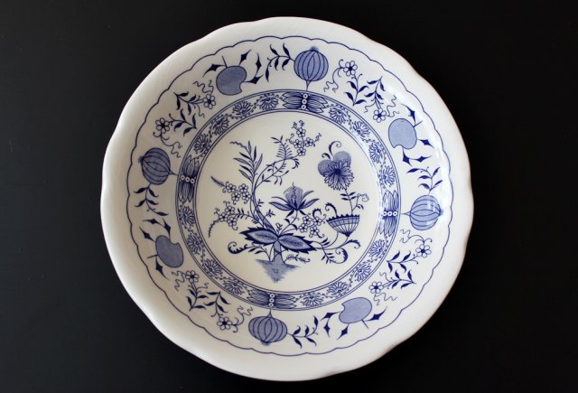 porcelana ecru szkliwiona z niebieskim wzorem cebulowym.