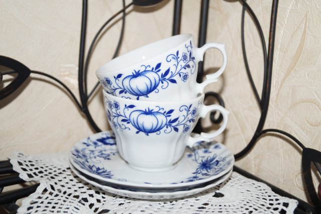 biała porcelana ozdobiona motywem cebulowym, ryflowane