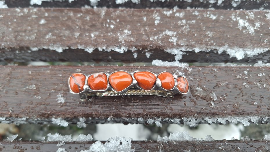 Klamra do włosów, wykonana z miedzi, cyny i jaspisów. Wymiary ok. 8 na 1.3 cm. Zapięcie 6 cm, metalowe.