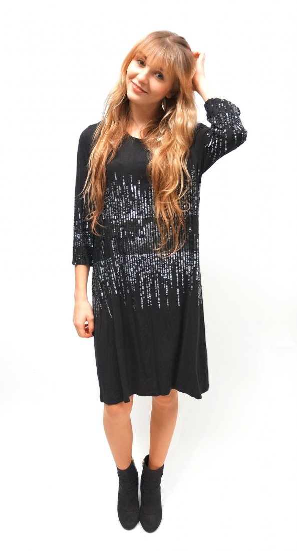 Luźna sukienka ozdobiona cekinami w różnych odcieniach szerości