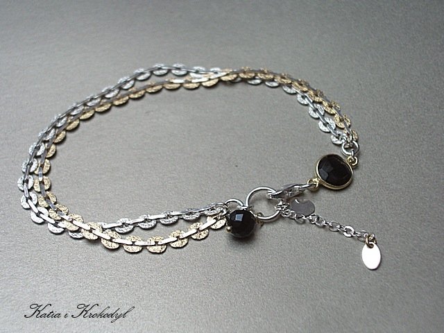 Bransoletka wykonana ze srebra i srebra pokrytego 24k złotem [pr.925] składająca się z dwóch łańcuszków [średnica oczek 4mm] ] w połączeniu z fasetowana kuleczką onyksu oraz onyksem w okuciu .Całkowita długość bransoletki 19cm plus 3cm ozdobnej przedłużki. Biżuteria ozdobnie zapakowana.