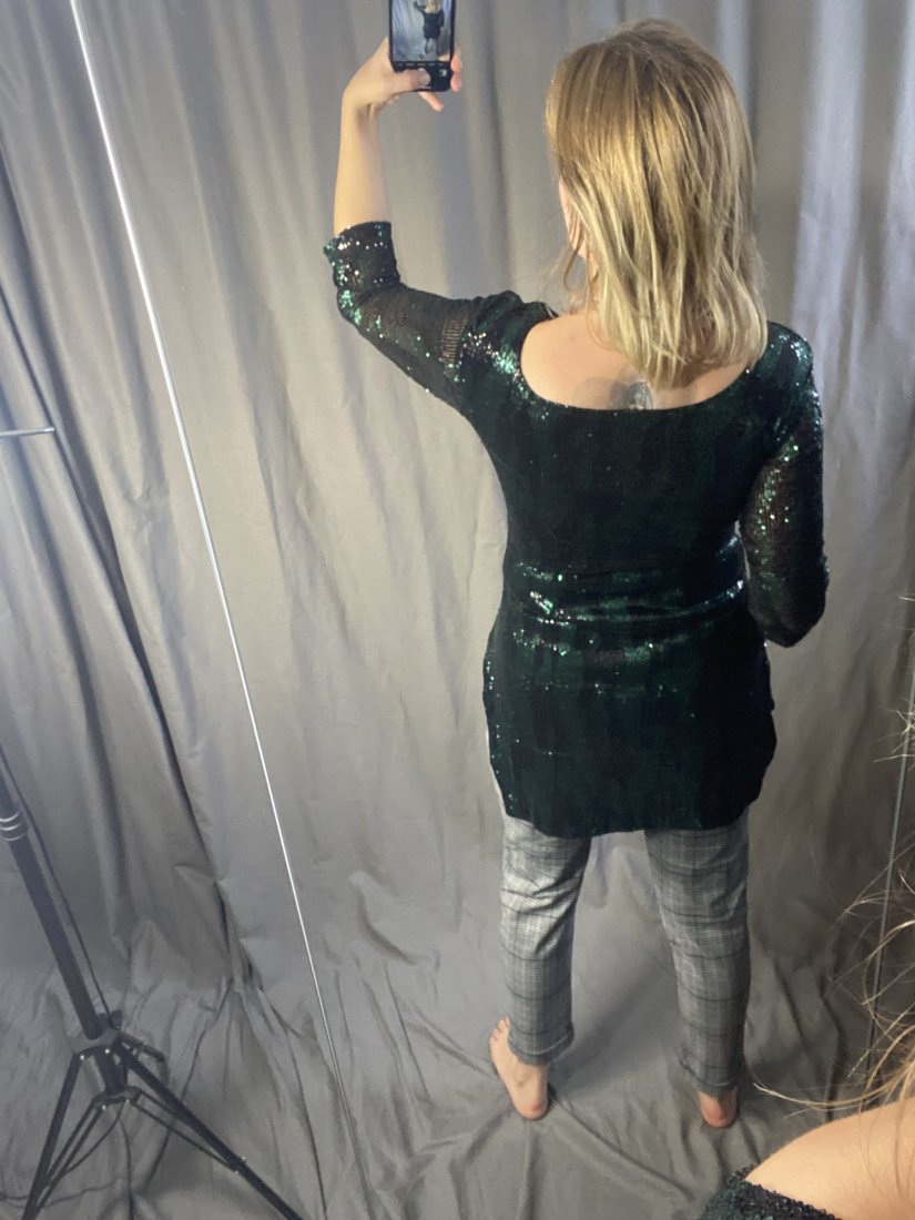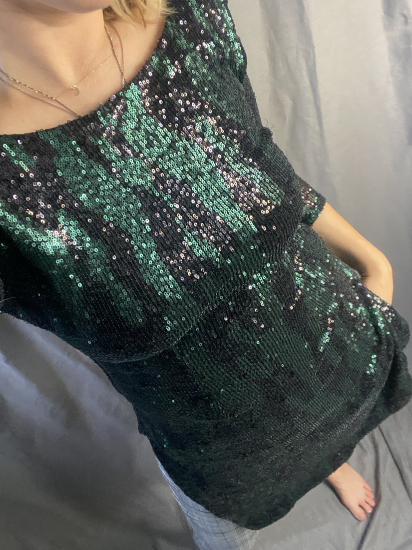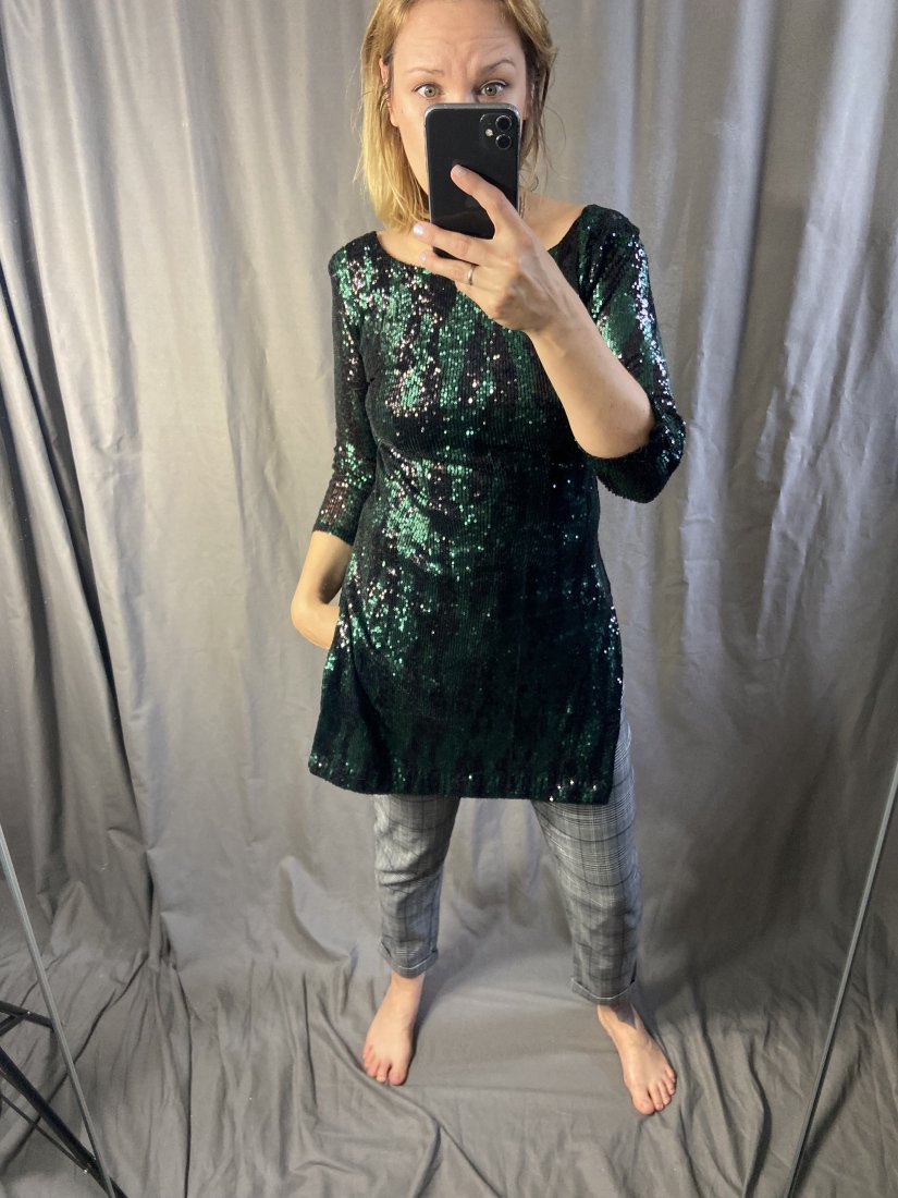 Cekinowa tunika w jakby cętki. Butelkowa zieleń + czerń. Baza elastyczna, śliska. Uszyta przez krawcową.