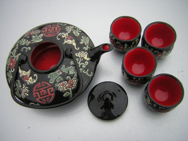 Zestaw - dzbanek -imbryk i cztery Czarki do celebracji picia herbaty. ..niesamowity, niespotykany !!! Dzbanek płaski jak latający talerz. ..intrygujące zdobienia. Nie sygnowany, ale dobrze wykonany. Graficzne barwy...dominantą lakowa błyszcząca czerń i czerwień. Wzór wklęsło - wypukły. ..każdy nieco inny, jak na ręczne wykonanie przystało. Satynowo - matowo - błyszczący. Dzbanek z poręczną metalową, ruchomą rączką w satynowej czerni. Przykrywka z dziurką odpowietrzającą. Czarki pękate, dobrze w dłoni leżące. Ciekawe, bo od spodu dziurką przez którą widać wyżej usytuowane dno Czarki. ...zupełnie nie wiem, jak udało się to artyście wykonać. ..Artystyczny, orientalny rarytas ;)