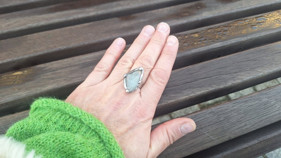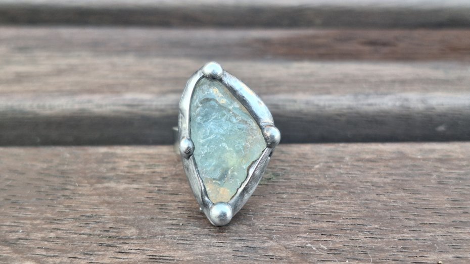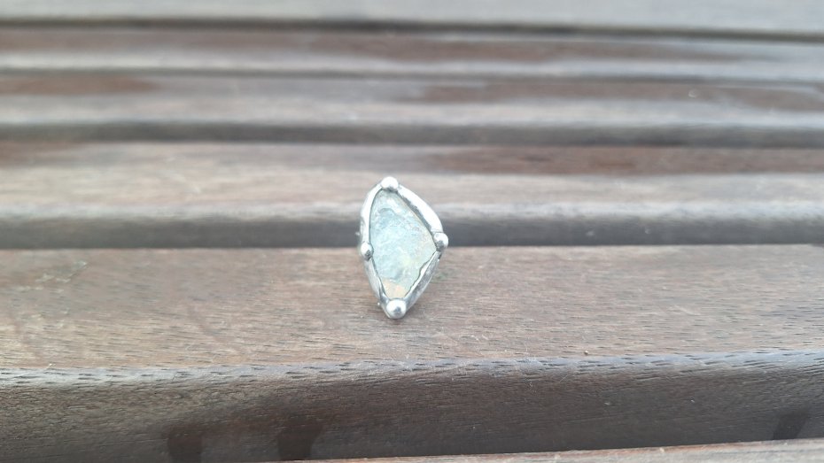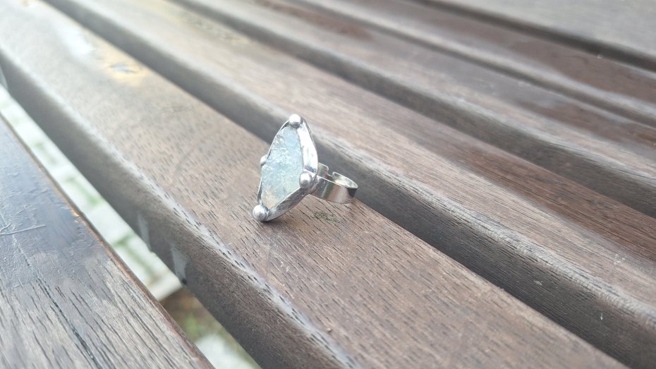 Pierścionek wykonany z miedzi, cyny i surowego celestynu. Wymiary ok. 2.5 na 1.5 cm. Regulowany. Nie jest ciężki.