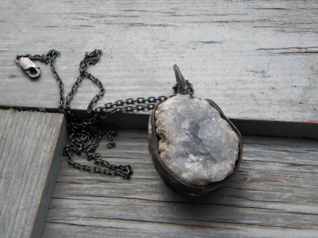 naszyjnik z surowego kawałka celestynu oprawionego w ocynowaną miedz. stylizowany na stare srebro. wymiary wisiora 5,2cm x 3,2 cm. łańcuszek z posrebrzanej,oksydowannej miedzi z zapięciem z oksydowanego srebra - długość 65cm
