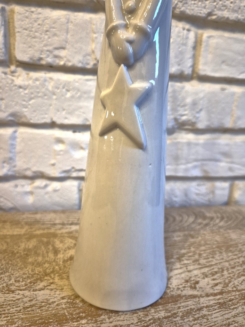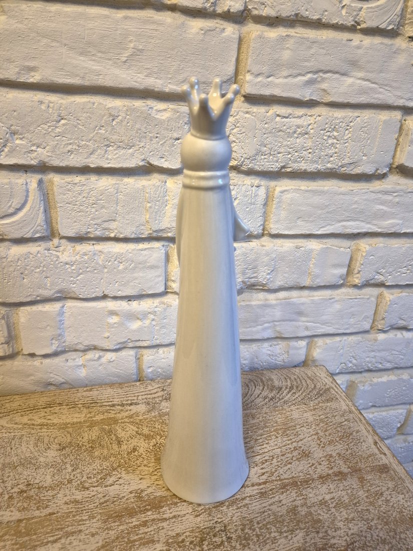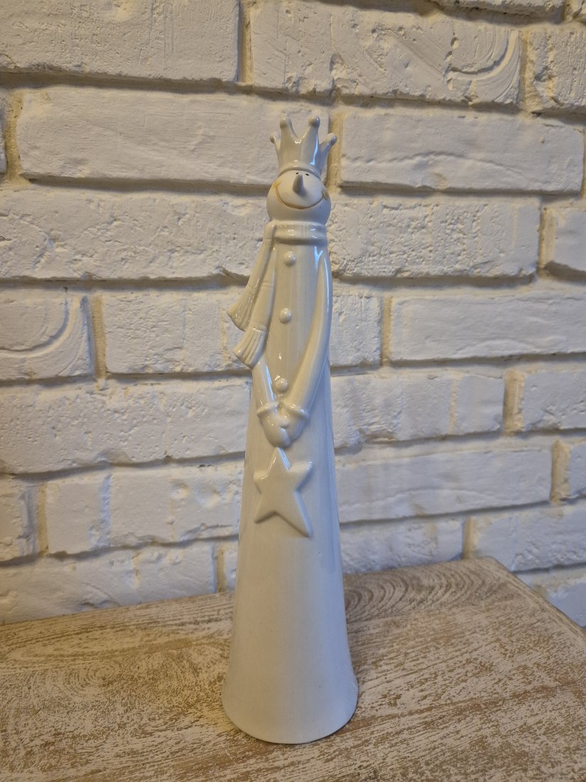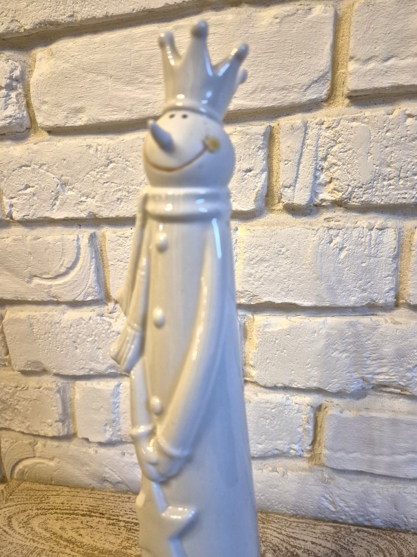 ceramiczna biała duża figurka świątecznego skrzata w koronie, szaliku i gwiazdą w ręku:)