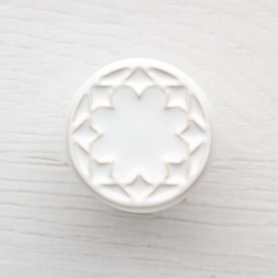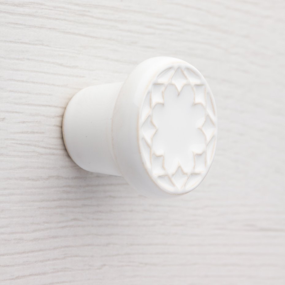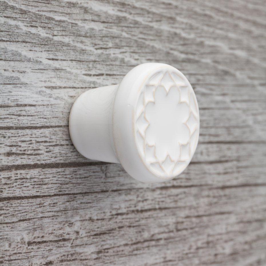Ceramiczna gałka do mebli z lekko wypukłym ornamentem. Ręcznie wykonana z jasnej gliny, pokryta błyszczącym szkliwem. Twoje meble zyskają nowy, niepowtarzalny, jedyny w swoim rodzaju wygląd.