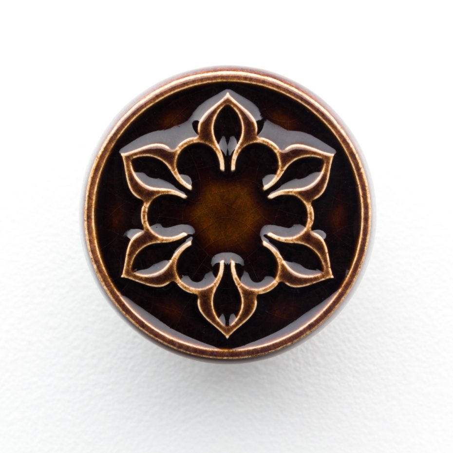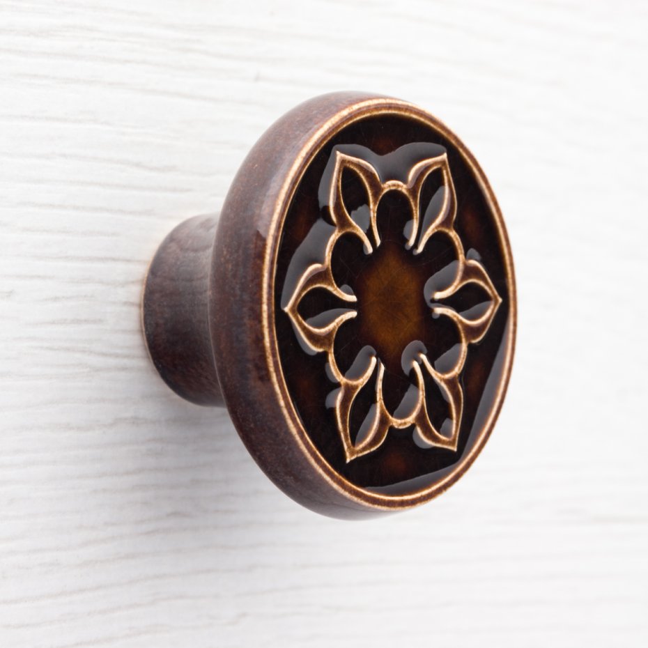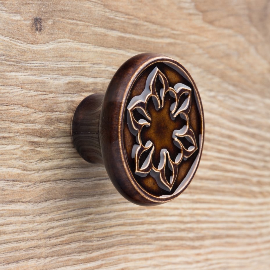 Ceramiczna gałka do mebli – ręcznie wykonana, ornamentowa, wg własnego projektu. Wykonana z jasnej gliny, pokryta błyszczącym szkliwem.