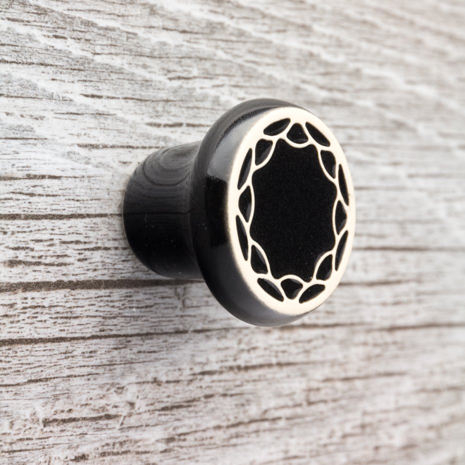 Ceramiczne gałki do mebli - ręcznie wykonane, ornamentowe, wg własnego projektu. Wykonane z jasnej gliny, pokryte błyszczącym, czarnym szkliwem, wypalone dwukrotnie w wysokiej temperaturze. Twoje meble zyskają nowy, niepowtarzalny, jedyny w swoim rodzaju wygląd.