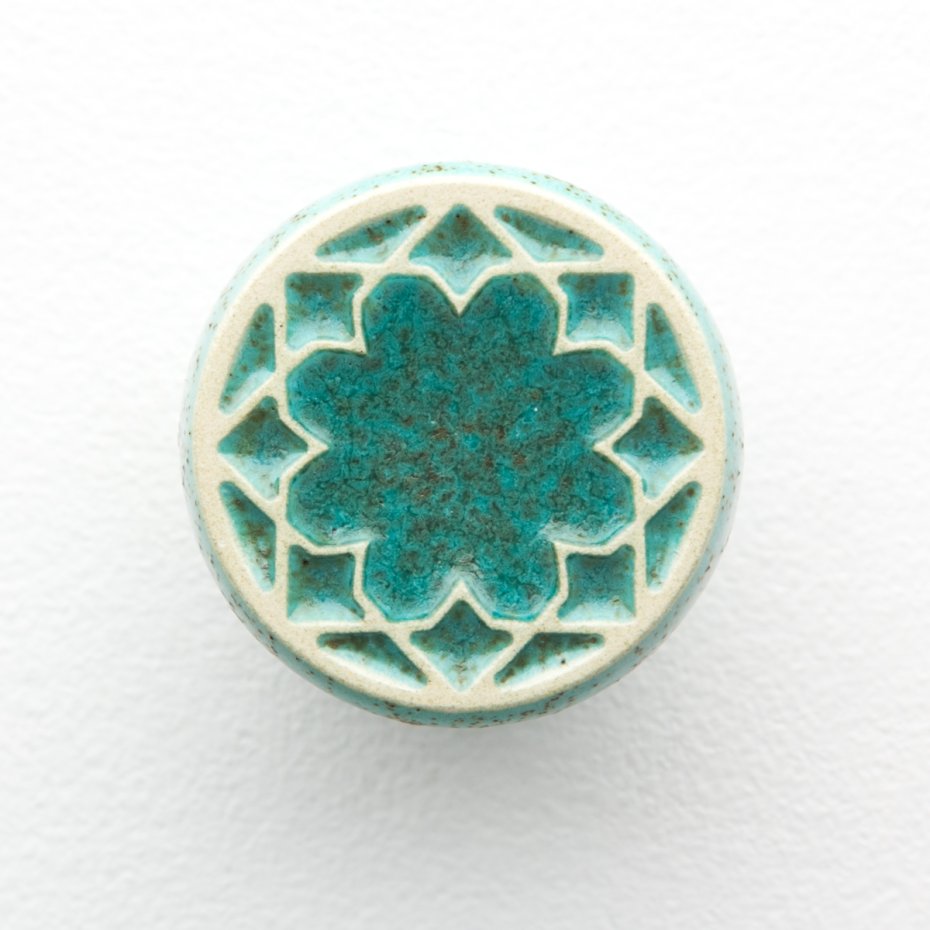 Ceramiczna gałka do mebli z lekko wypukłym ornamentem. Ręcznie wykonana z jasnej gliny, pokryta satynowym, lekko błyszczącym szkliwem. Twoje meble zyskają nowy, niepowtarzalny, jedyny w swoim rodzaju wygląd.