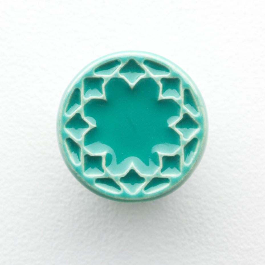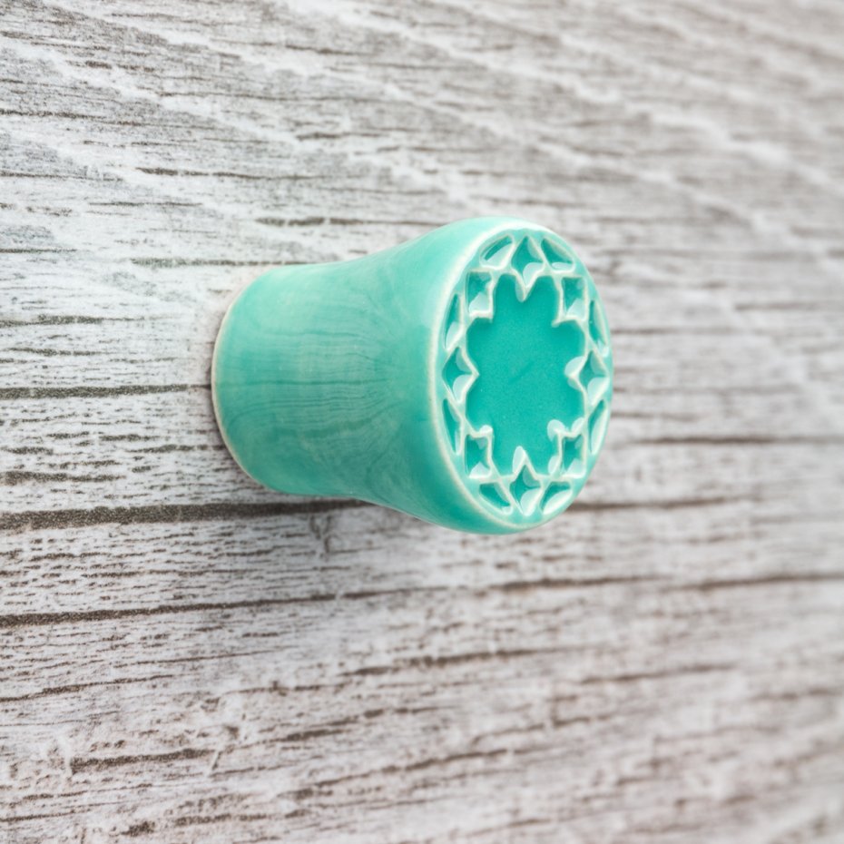 Ceramiczna gałka do mebli z lekko wypukłym ornamentem. Ręcznie wykonana z jasnej gliny, pokryta błyszczącym szkliwem. Twoje meble zyskają nowy, niepowtarzalny, jedyny w swoim rodzaju wygląd.
