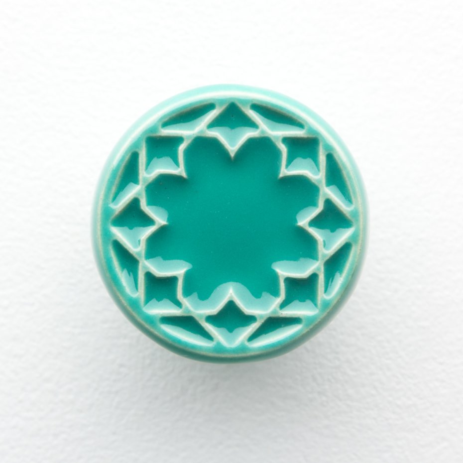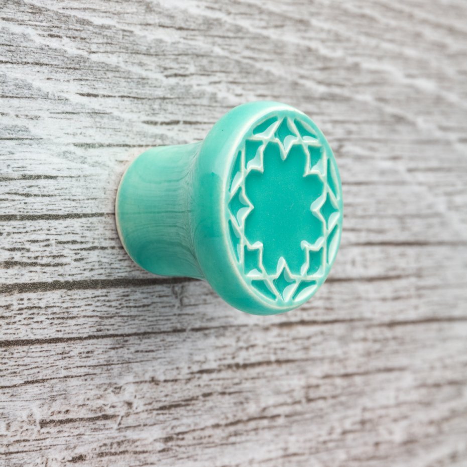 Ceramiczna gałka do mebli z lekko wypukłym ornamentem. Ręcznie wykonana z jasnej gliny, pokryta błyszczącym szkliwem. Twoje meble zyskają nowy, niepowtarzalny, jedyny w swoim rodzaju wygląd.