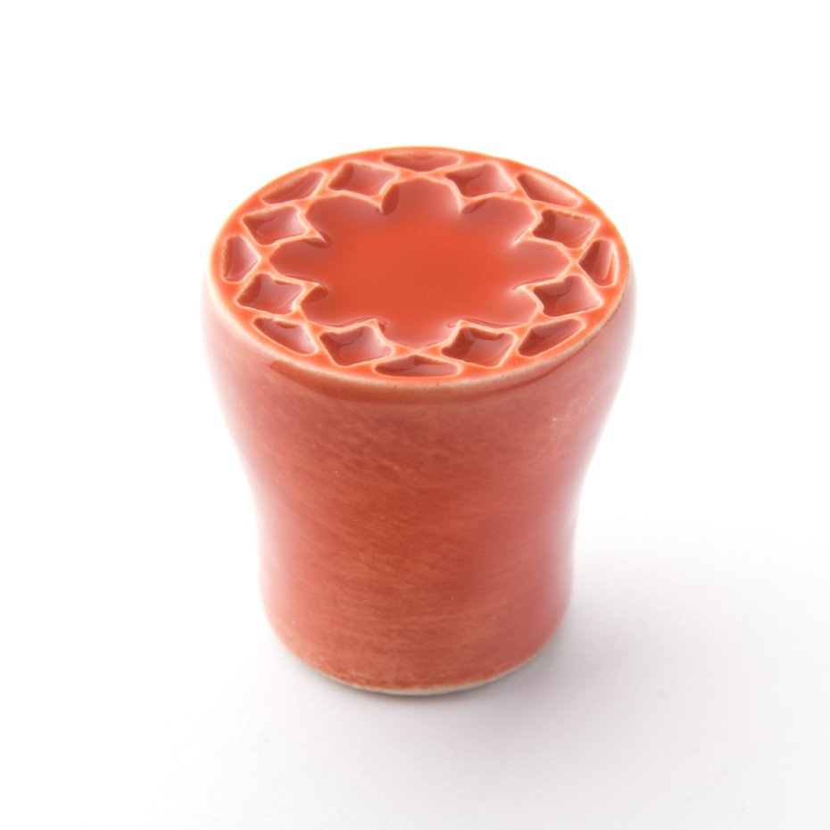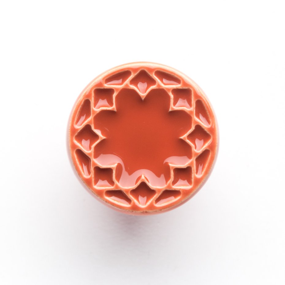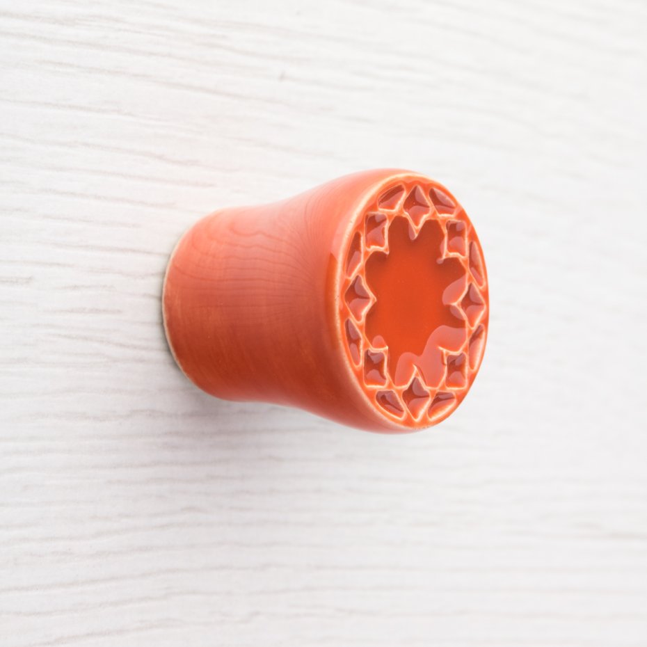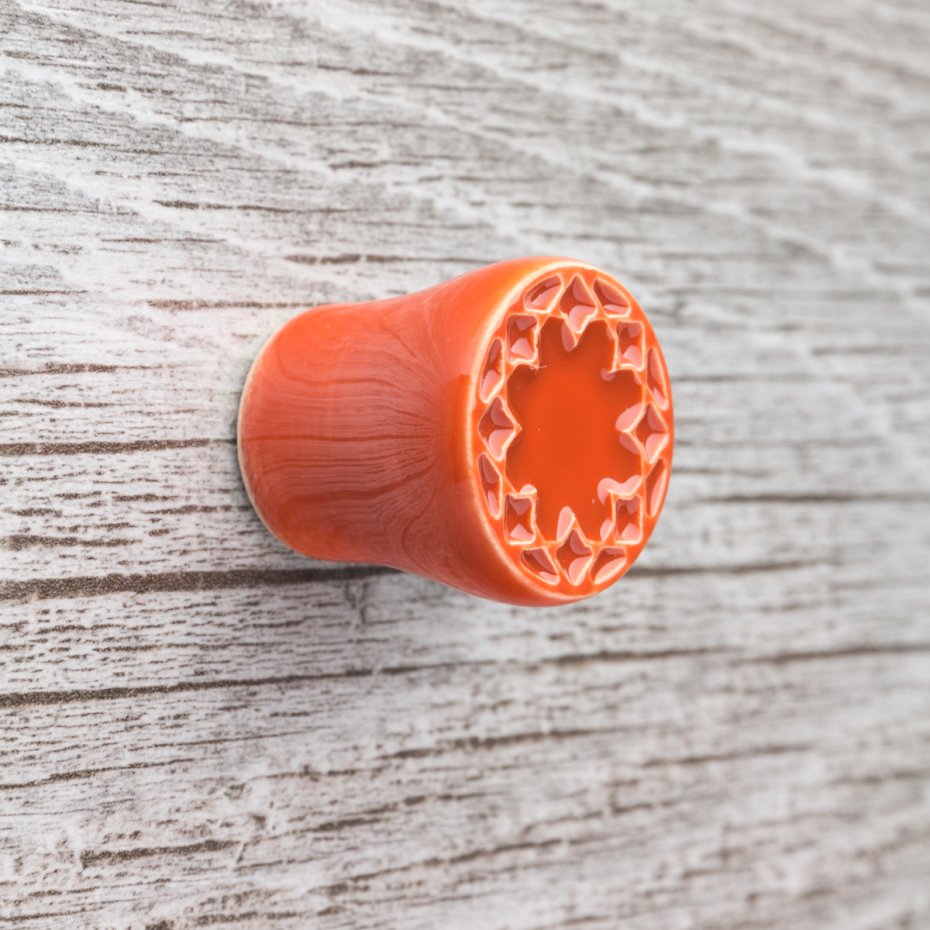 Ceramiczna gałka do mebli z lekko wypukłym ornamentem. Ręcznie wykonana z jasnej gliny, pokryta błyszczącym szkliwem. Twoje meble zyskają nowy, niepowtarzalny, jedyny w swoim rodzaju wygląd.