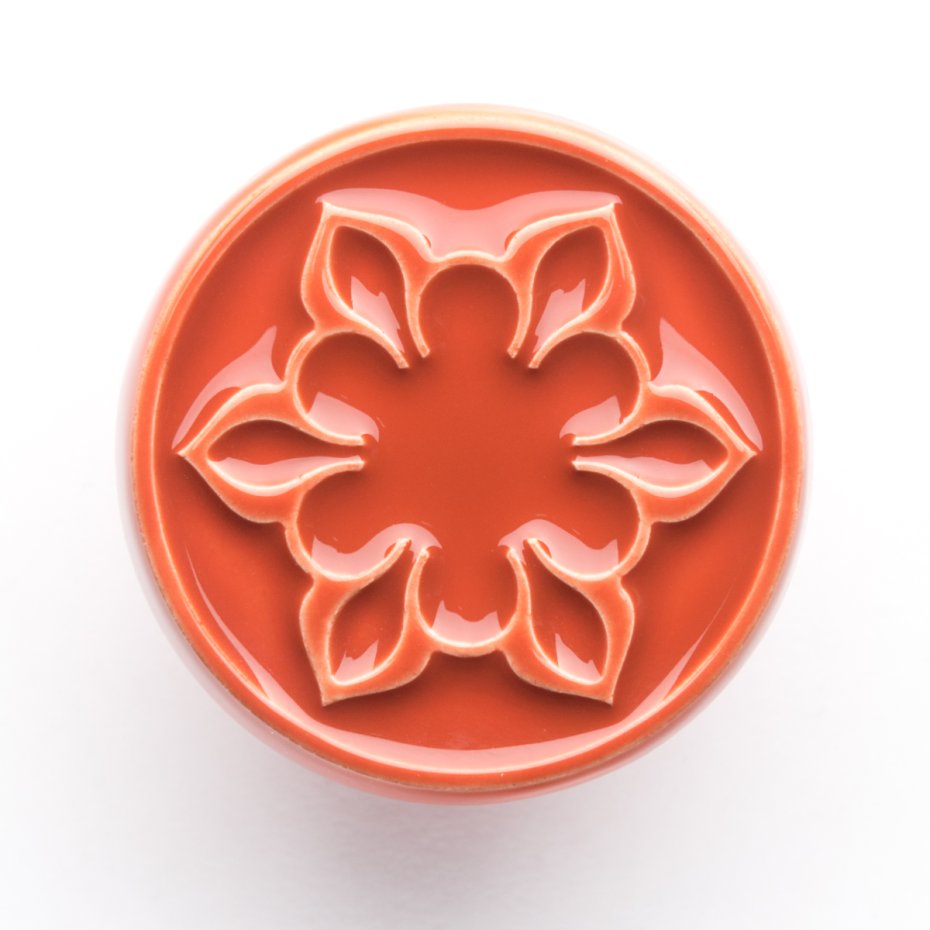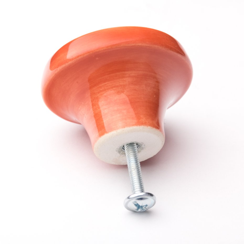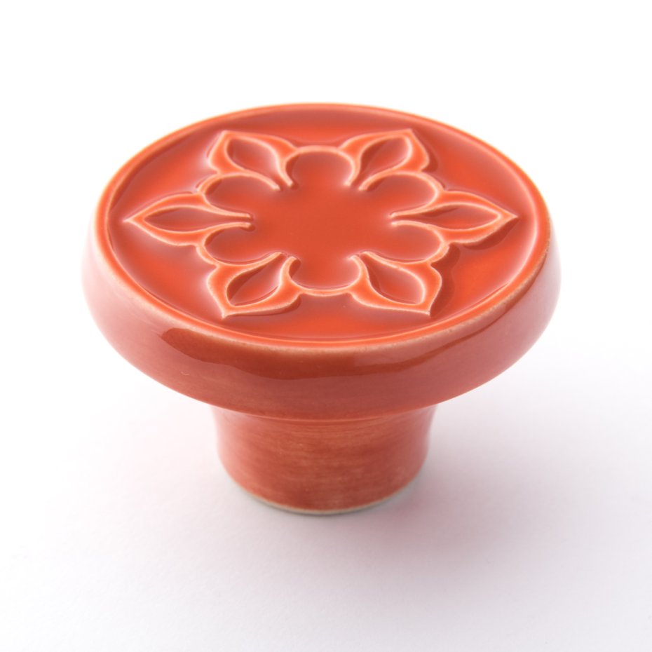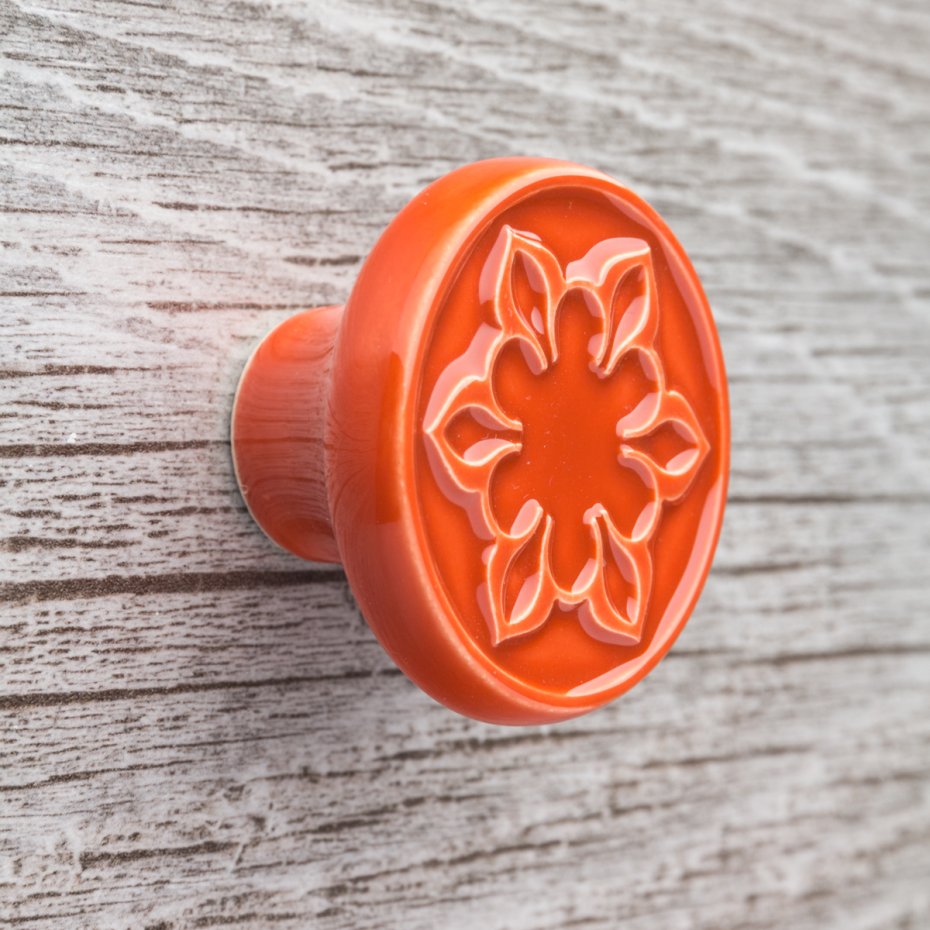 Ceramiczna gałka do mebli z lekko wypukłym ornamentem. Ręcznie wykonana z jasnej gliny, pokryta błyszczącym szkliwem.
