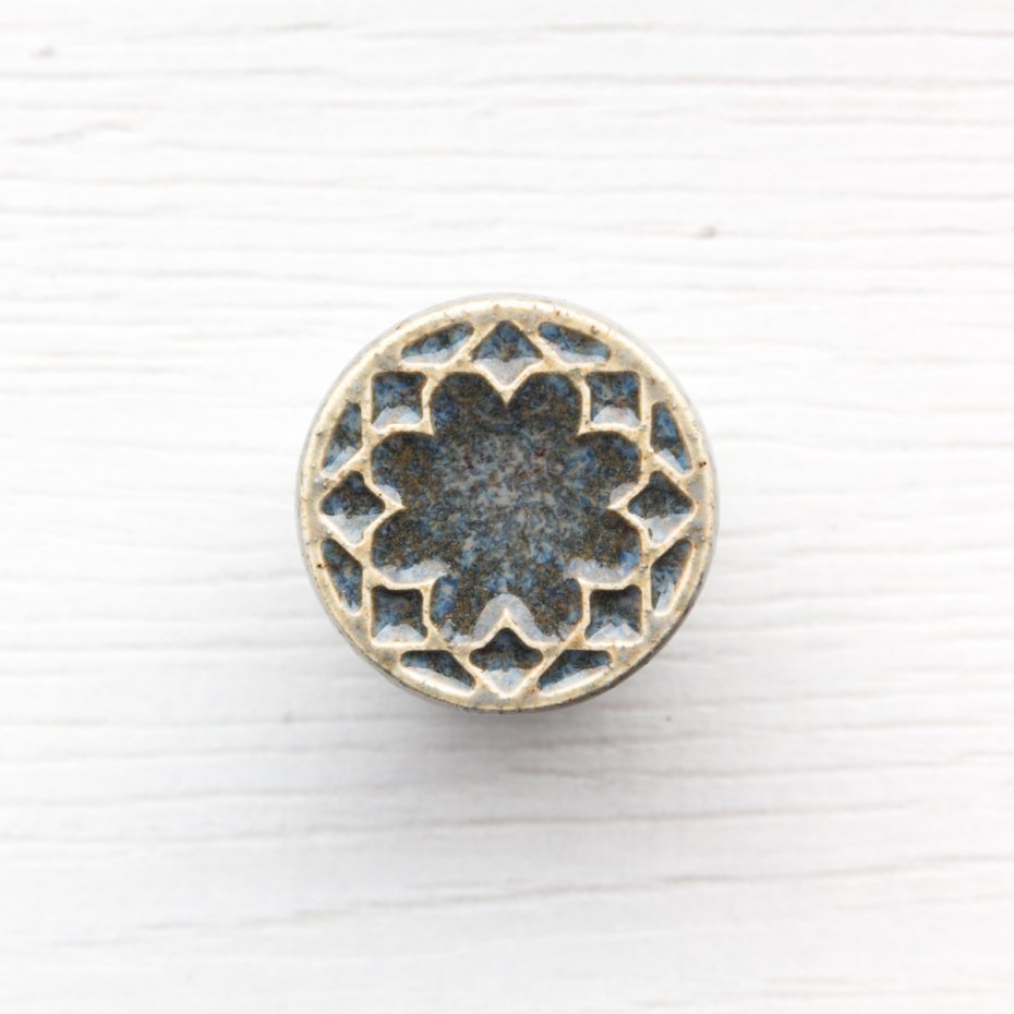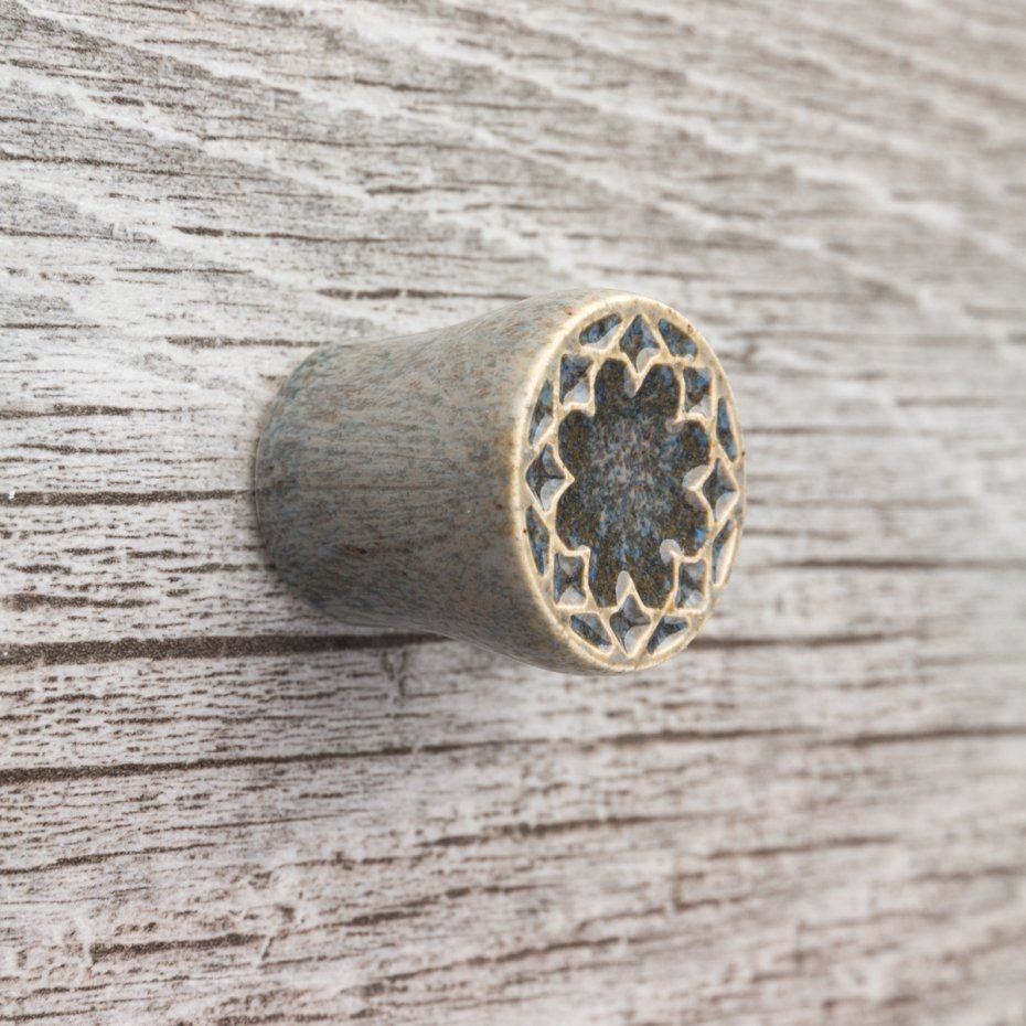 Ceramiczna gałka do mebli z lekko wypukłym ornamentem. Ręcznie wykonana z jasnej gliny, pokryta błyszczącym szkliwem. Twoje meble zyskają nowy, niepowtarzalny, jedyny w swoim rodzaju wygląd.