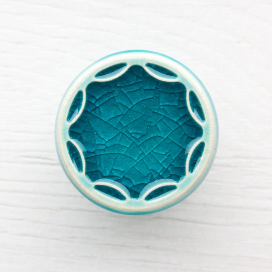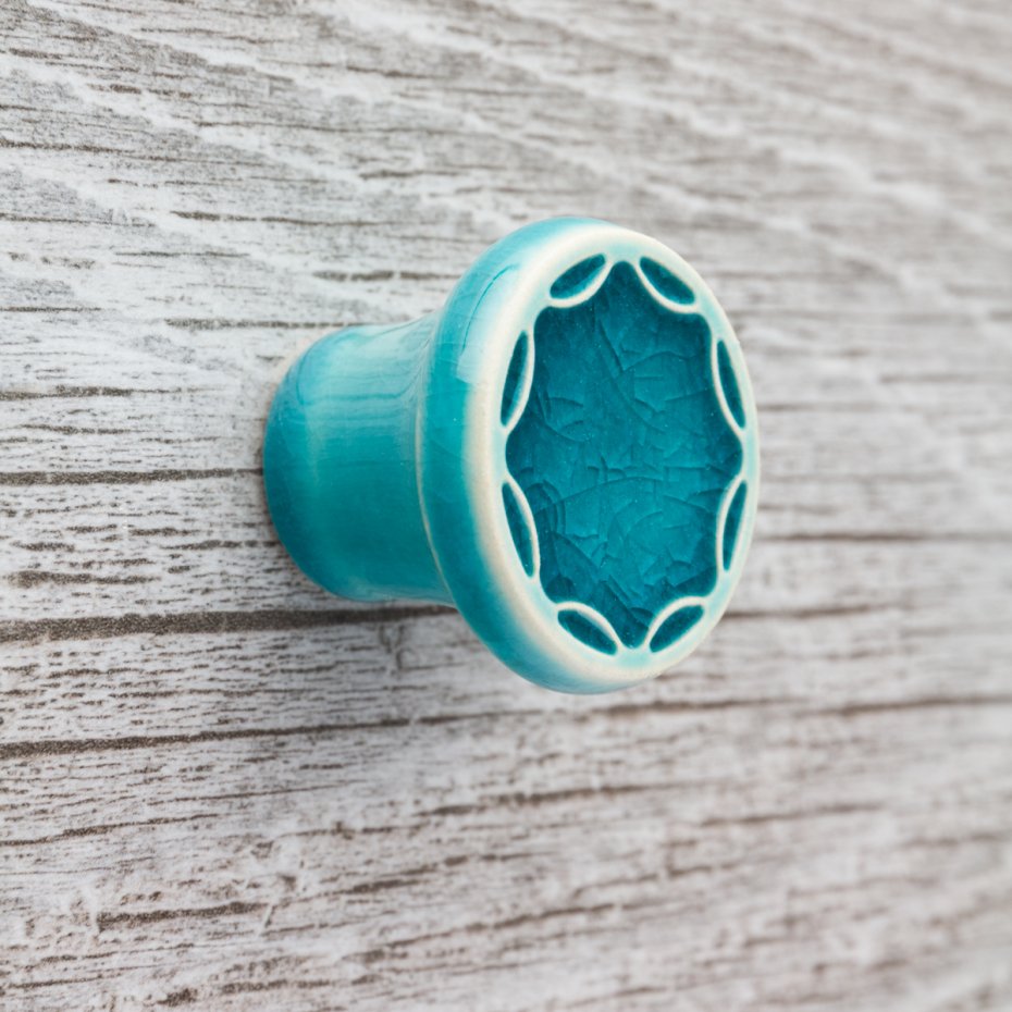 Ceramiczna gałka do mebli z lekko wypukłym ornamentem. Ręcznie wykonana z jasnej gliny, ręcznie szkliwiona, wypalona dwukrotnie w wysokiej temperaturze. Twoje meble zyskają nowy, niepowtarzalny, jedyny w swoim rodzaju wygląd.