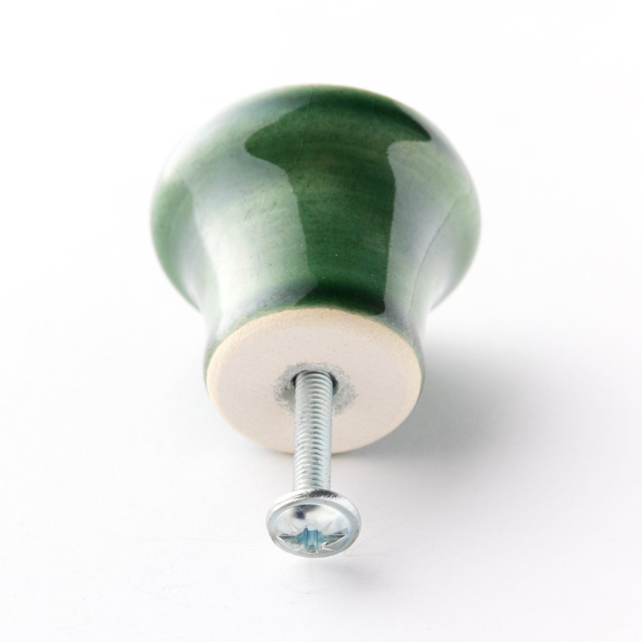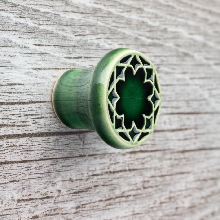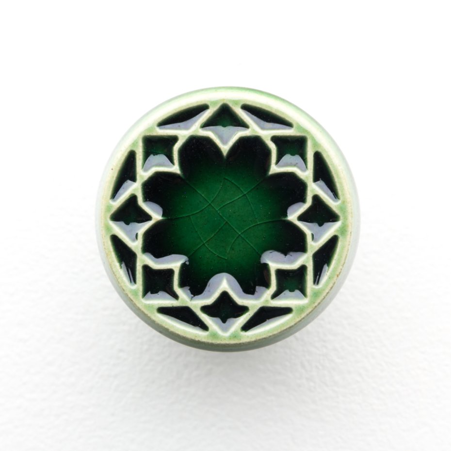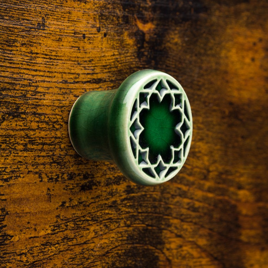 Ceramiczna gałka do mebli z lekko wypukłym ornamentem. Ręcznie wykonana z jasnej gliny, pokryta błyszczącym szkliwem. Twoje meble zyskają nowy, niepowtarzalny, jedyny w swoim rodzaju wygląd.