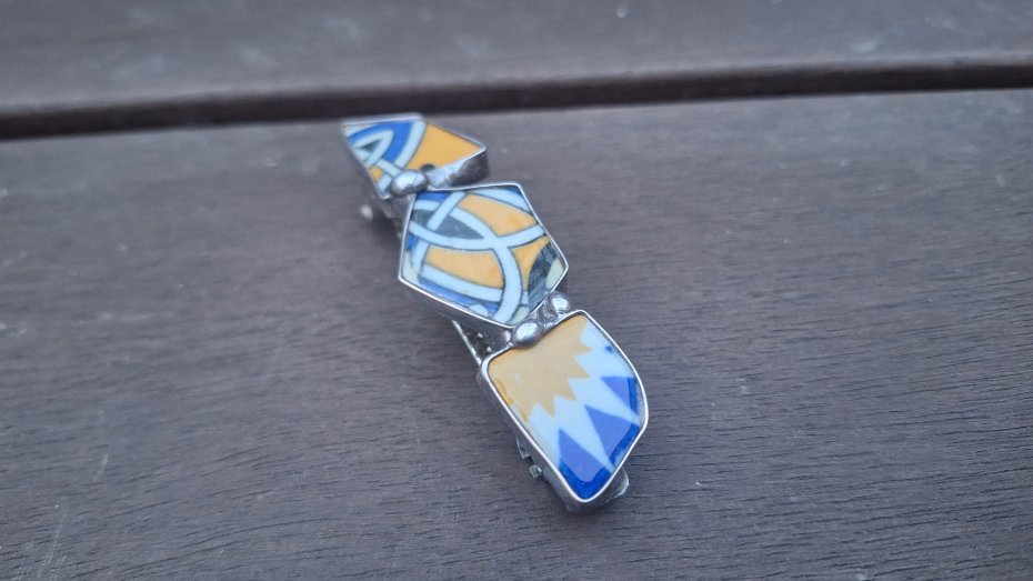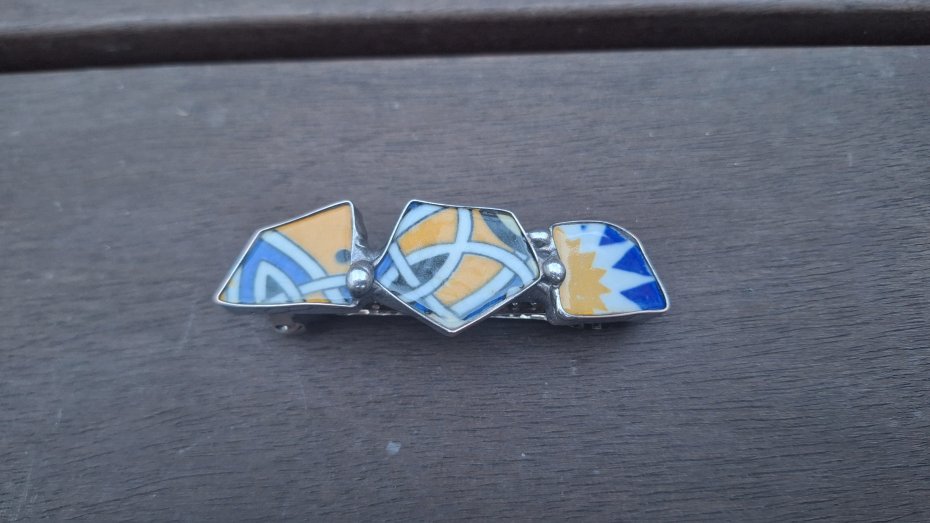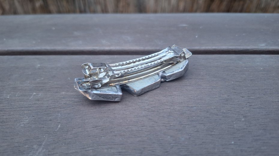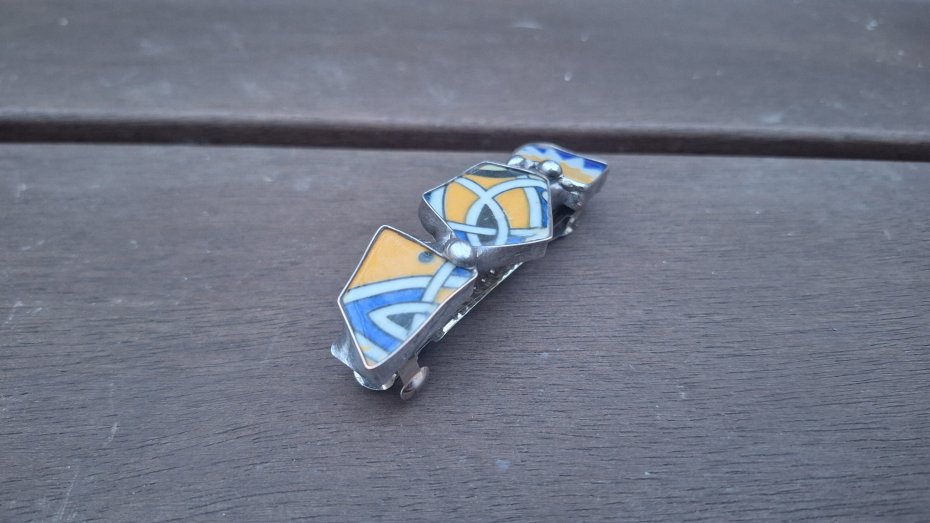 Klamra do włosów, wykonana z miedzi, cyny i ceramiki. Wymiary ok. 8 na 2.3 cm. Zapięcie 6 cm, metalowe.