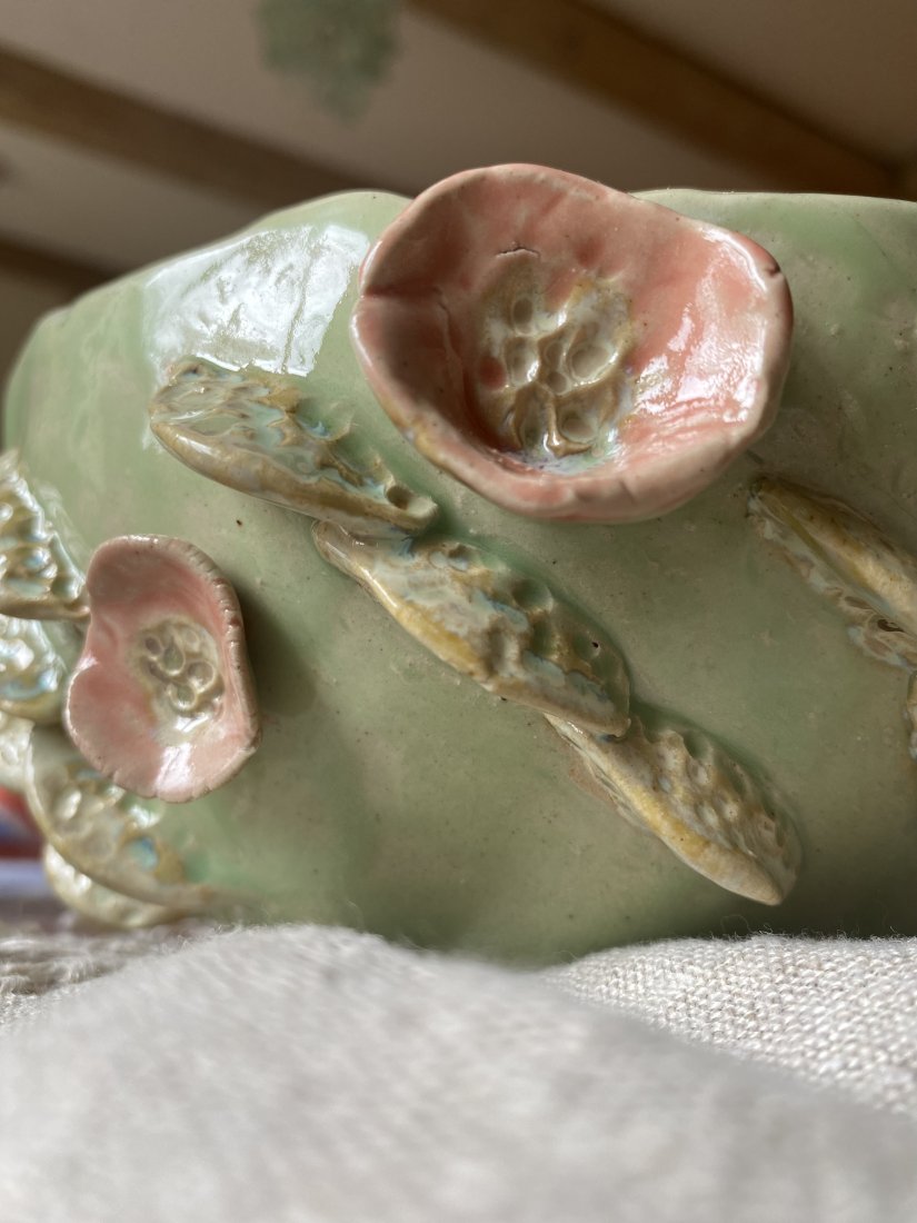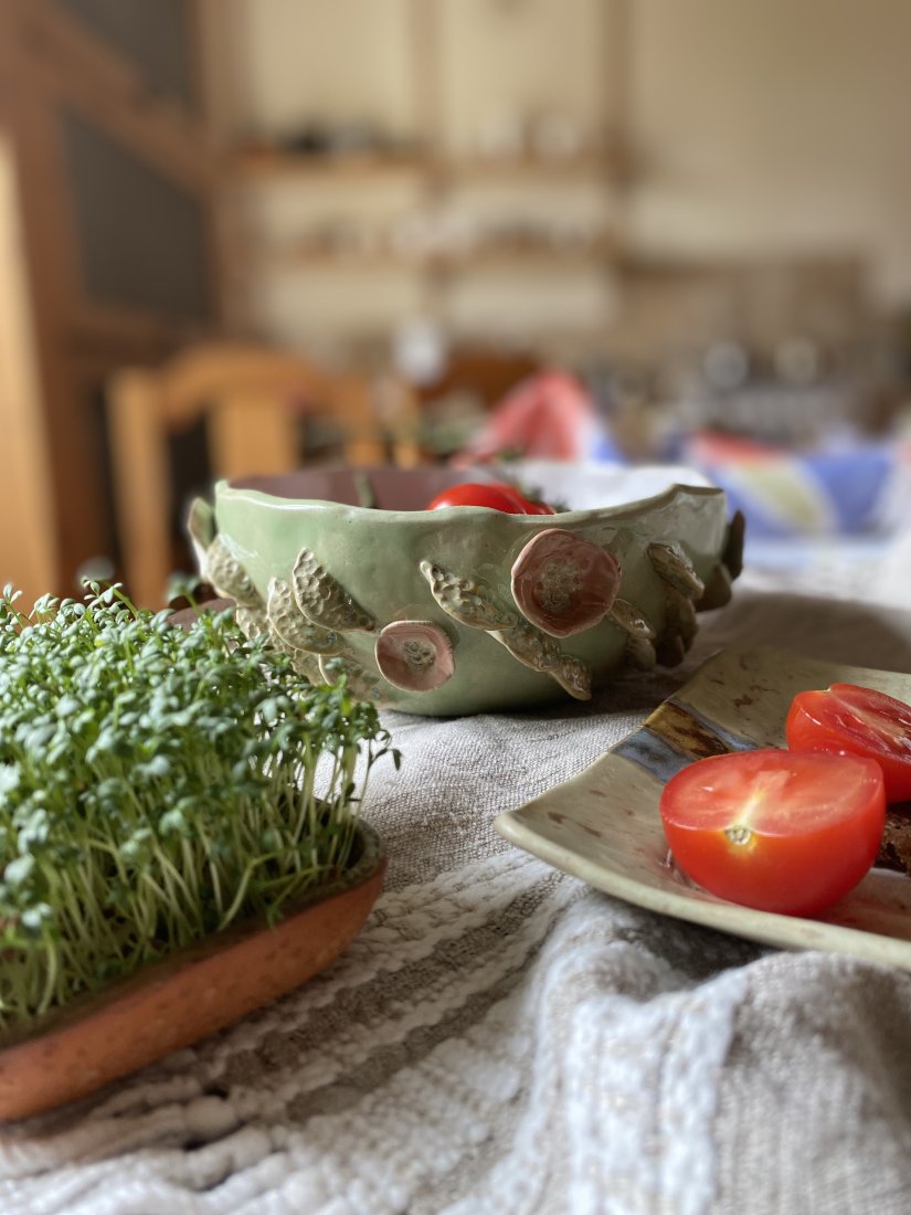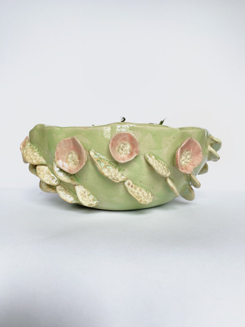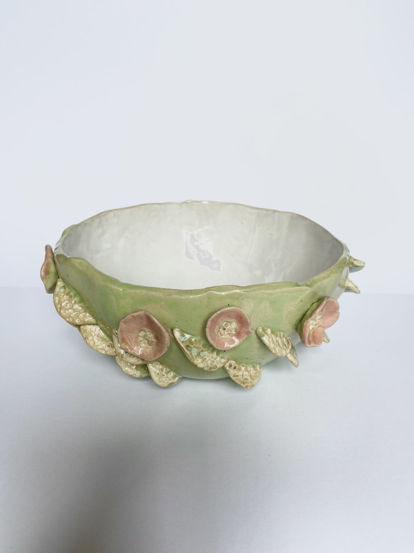 Ceramiczna miska z ozdobnymi kwiatkami. Jeden z nich pozostał niepomalowany, dzięki czemu można dotknąć naturalnej gliny. Szkliwa są przeznaczone do kontaktu z żywnością.