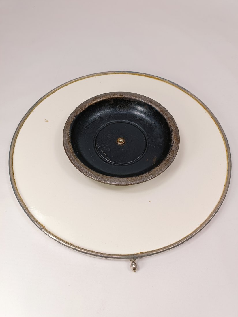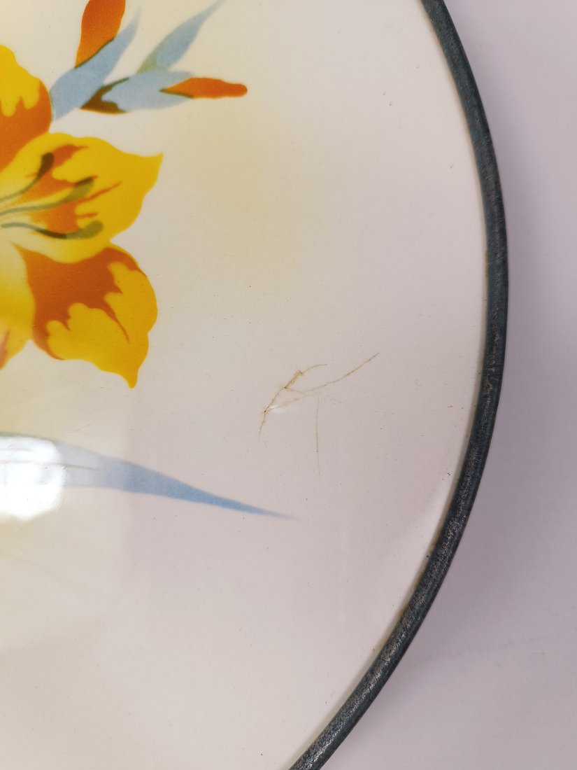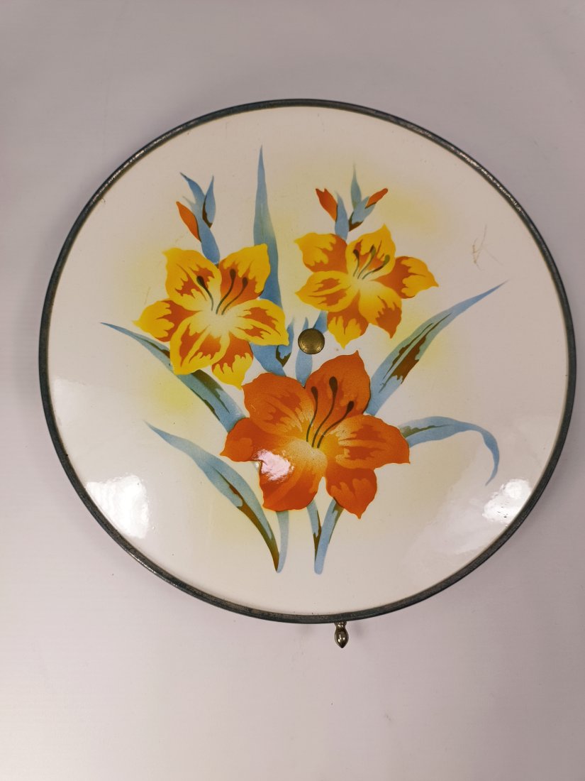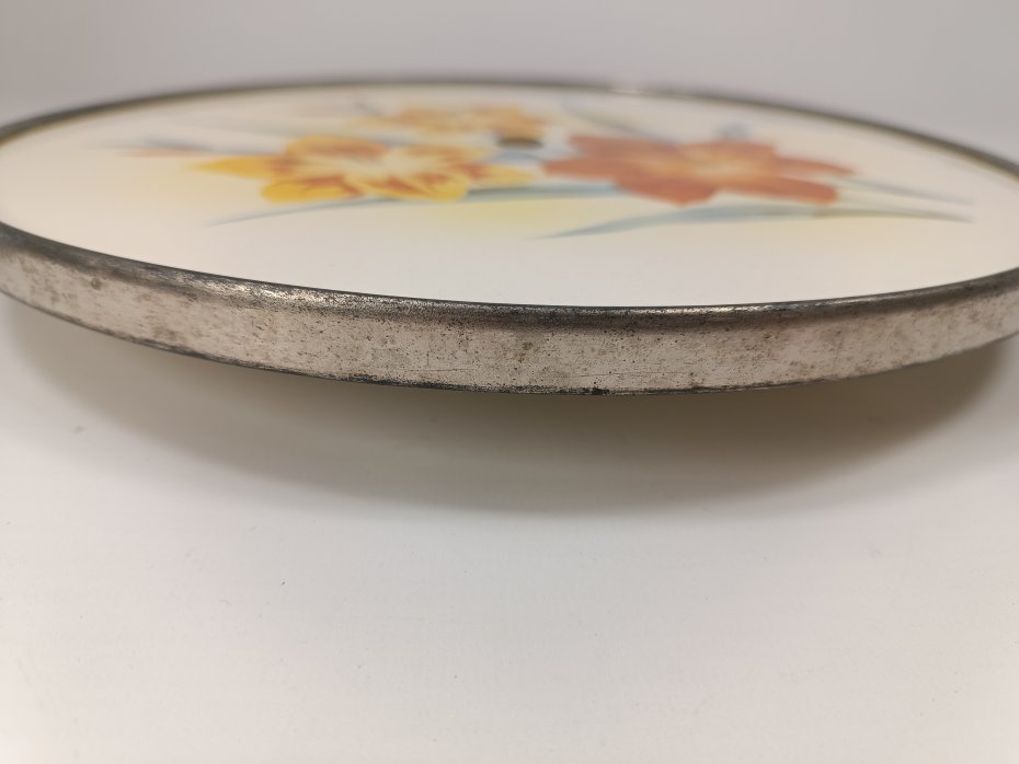 Porcelanowa patera z wzorem kwiatowym, obrotowa. Na paterze widoczne są ślady czasu. Średnica 30 cm. Sygnowana.