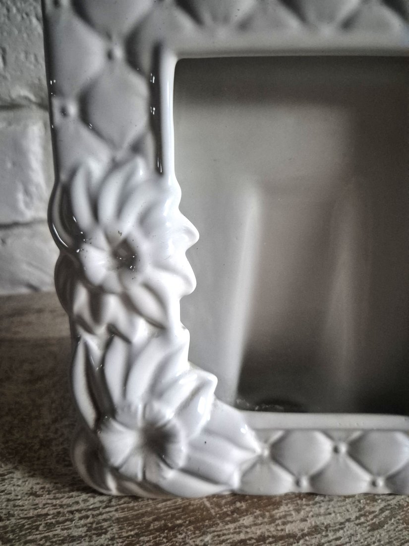 piękna biała ceramiczna ramka na zdjęcia z wytłaczanymi kwiatami i wzorami, z szybką, zdjęcie jest wkładane od góry, dosyć ciężka